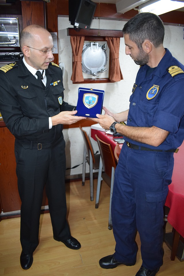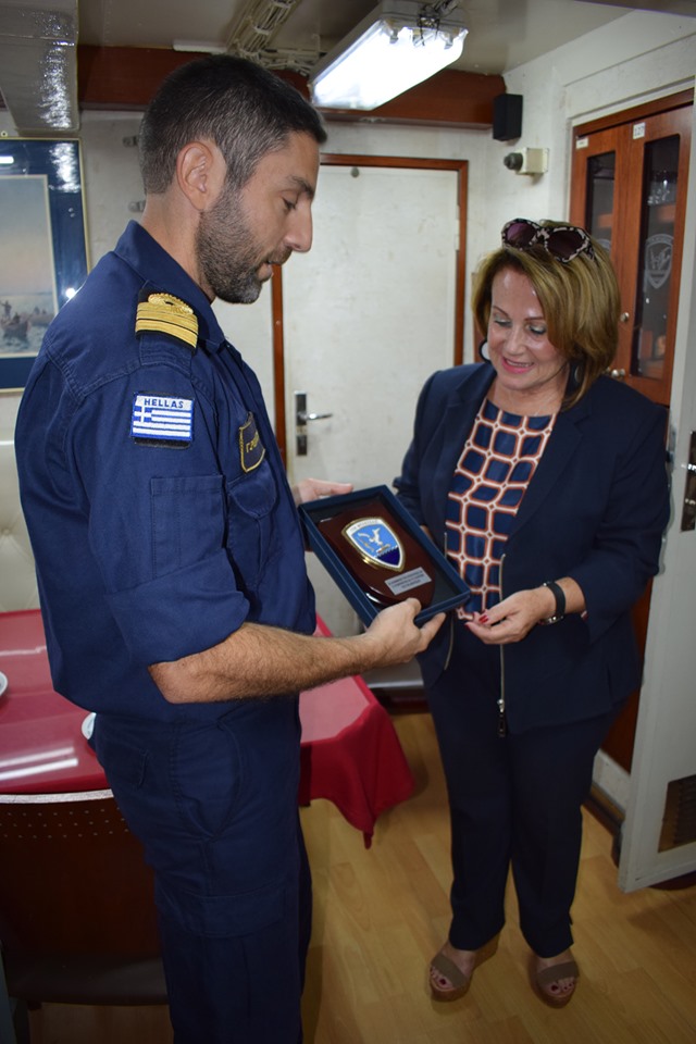 Το πολεμικό πλοίο υποδέχθηκαν στο Λιμάνι η Διευθύντρια του ΙΑΜΥ Κωνσταντίνα Αδαμοπούλου και ο Λιμενάρχης Ύδρας Αντιπλοίαρχος ΛΣ Γεώργιος Μανδαλάκης τους οποίους δεξιώθηκε στο πλοίο ο Κυβερνήτης του, Πλωτάρχης Π.Ν. Γεώργιος Ρεπαντής και αντάλλαξε μαζί τους αναμνηστικά δώρα, συμβολικά της περίστασης και της επίσκεψης του πλοίου στο νησί.