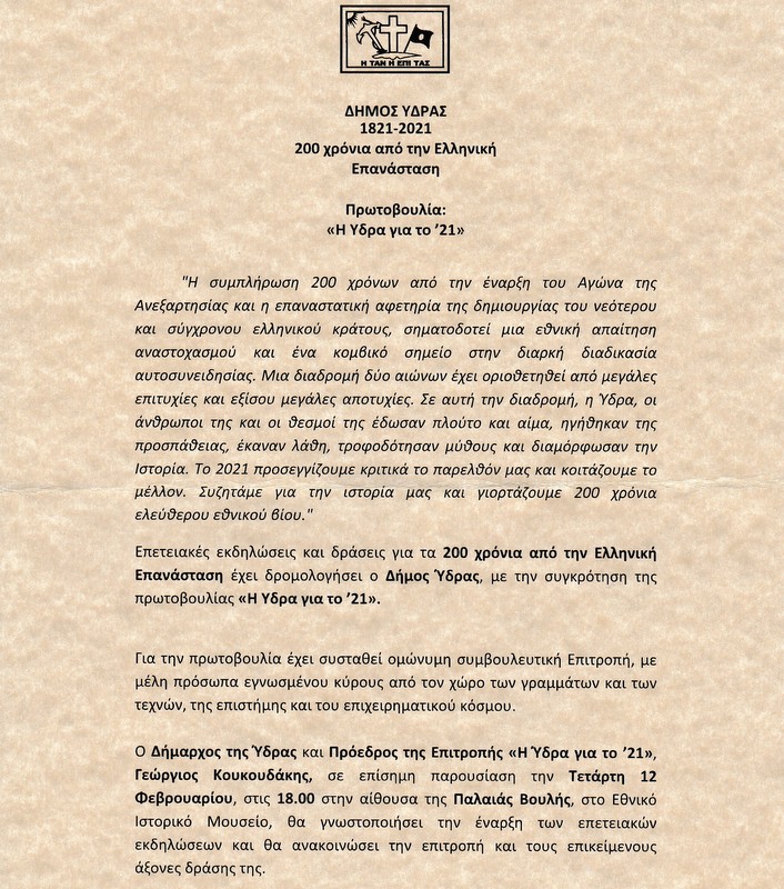 Για τα 200 χρόνια από την Ελληνική Επανάσταση ο Δήμος Ύδρας, σχεδιάζει ένα επετειακό πρόγραμμα που θα εκτείνεται από το Β’ εξάμηνο του 2020 έως τον Δεκέμβριο του 2021.