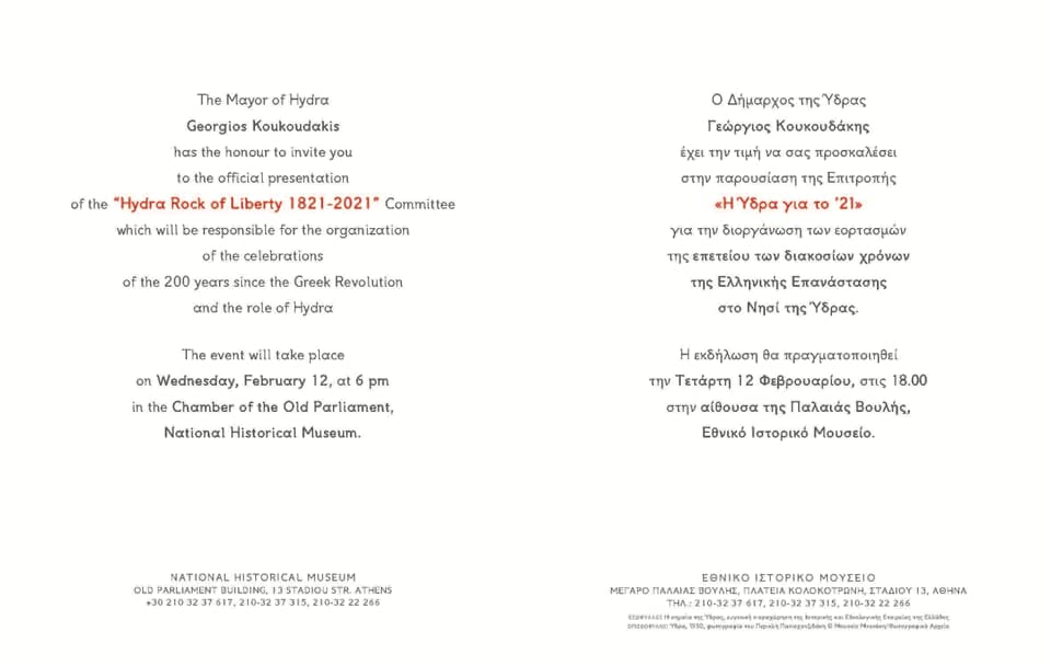 Για τον σκοπό αυτό συγκροτήθηκε μια συμβουλευτική Επιτροπή με τη συμβολική ονομασίας «Η Ύδρα για το ’21», την οποία θα παρουσιάσει ο Δήμαρχος της Ύδρας και Πρόεδρος της Επιτροπής κ. Γεώργιος Κουκουδάκης, την Τετάρτη 12 Φεβρουαρίου, στις 18.00 στην αίθουσα της Παλαιάς Βουλής, στο Εθνικό Ιστορικό Μουσείο (Πλατεία Κολοκοτρώνη, Σταδίου 13, Αθήνα).