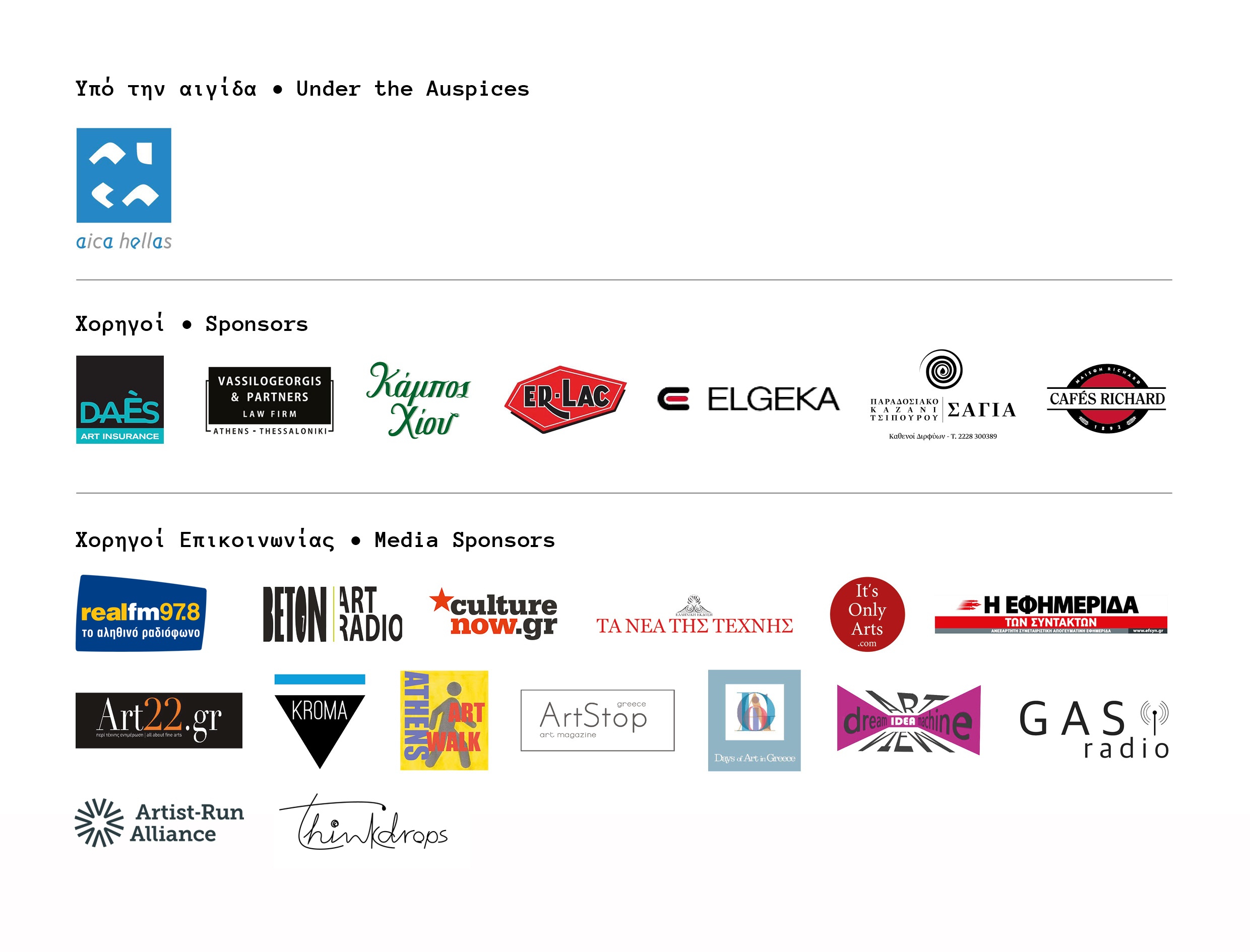 A Very Very Happy Gallery (Καναδάς, Χονγκ Κονγκ), ABC Gallery (Ρωσία), ACEY Europe (Ελλάδα, Κύπρος), AKA artist-run (Καναδάς), AMV (Καναδάς), ArtCode (Ελλάδα), ARTIA GALLERY(Ελλάδα ), artplatform |elsewhere (Ολλανδία), ASSOCIATION THÈÂTRE DIONYSOS ET APOLLON (Ελλάδα, Γαλλία), ATHENS STREET ART FESTIVAL (Ελλάδα), Αυτοβιογραφικά Συστήματα / Autobiographical Systems (Ελλάδα), Bcademie (Ολλανδία ), BEASTON Projects (Μ. Βρετανία), BIG - Biennale Interstellaire des espaces d'art de Genève (Ελβετία), Binary art group (Κύπρος), Bureau d'art et de recherche, Roubaix (Γαλλία), Cable Depot (Μ. Βρετανία), Chicago Artists Platforms (ΗΠΑ), Come alone (Ελλάδα, Γαλλία, Ιταλία), Cube Art Editions (Ελλάδα), CYBORG/ASMA (Ελλάδα), D.E.U.S (Ελλάδα & Βέλγιο), DAS ESSZIMMER – space for art+ (Γερμανία) , Ed Video (Καναδάς), Embryo LLC (ΗΠΑ), EN FLO (Ελλάδα), EULENGASSE (Γερμανία), EX-MÊKH (Ολλανδία), Five Years & Darling Pearls & Co (Μ. Βρετανία), Fragments of truth + LaLa Art Group (Ελλάδα), Future Scenarios (Ολλανδία & Ελλάδα), GREYLIGHT PROJECTS (Ολλανδία & Βέλγιο), ID:I GALLERI (Σουηδία), IN VIVO (Ελλάδα), ITSONLYARTS (Ελλάδα), JAW (Μ. Βρετανία), JuJe (Καναδάς), Κ4+1 project (Ελλάδα ), Kaktos Project (Ελλάδα ), ΚΟΙΝΩΝΩ Τhe Tinos Gathering (Ελλάδα), Kunsthalle Graz - association for contemporary art (Αυστρία), Kunsthallekleinbasel (Ελβετία), METAPOLIS (Ελλάδα), Μεταφραστές - Meta-frastes (Ελλάδα), Mnky Bizz Group (ΗΠΑ), mp43 - project space for the peripheral (Γερμανία), Museum of Forgetting/TILT platform (Σουηδία , Ελλάδα), MUU Galleria (Φιλανδία), ΟΡΙΖΟΝΤΑΣ ΓΕΓΟΝΟΤΩΝ - ORIZONTAS GEGONOTON (Ελλάδα), penelope's webs (Ελλάδα), personal identity (Ελλάδα), Pow Wow (Ελλάδα), Project 2 (Ελλάδα), Rhythm Section (Αυστραλία, Κίνα, Γερμανία, Μεγάλη Βρετανία, Ιταλία, Ολλανδία, Ουκρανία), rosalux (Γερμανία), Sans Titre, Tourcoing (Γαλλία), Sepersepuluh (Ινδονησία), SHELTER Artists Run Space (Τουρκία), THE M{}ESUM (Γερμανία),TIDAL FLOW ART (Ελλάδα), Topp & Dubio (Ολλανδία), Tranformart Gallery (Σερβία), Y@oldnursery (Ελλάδα )