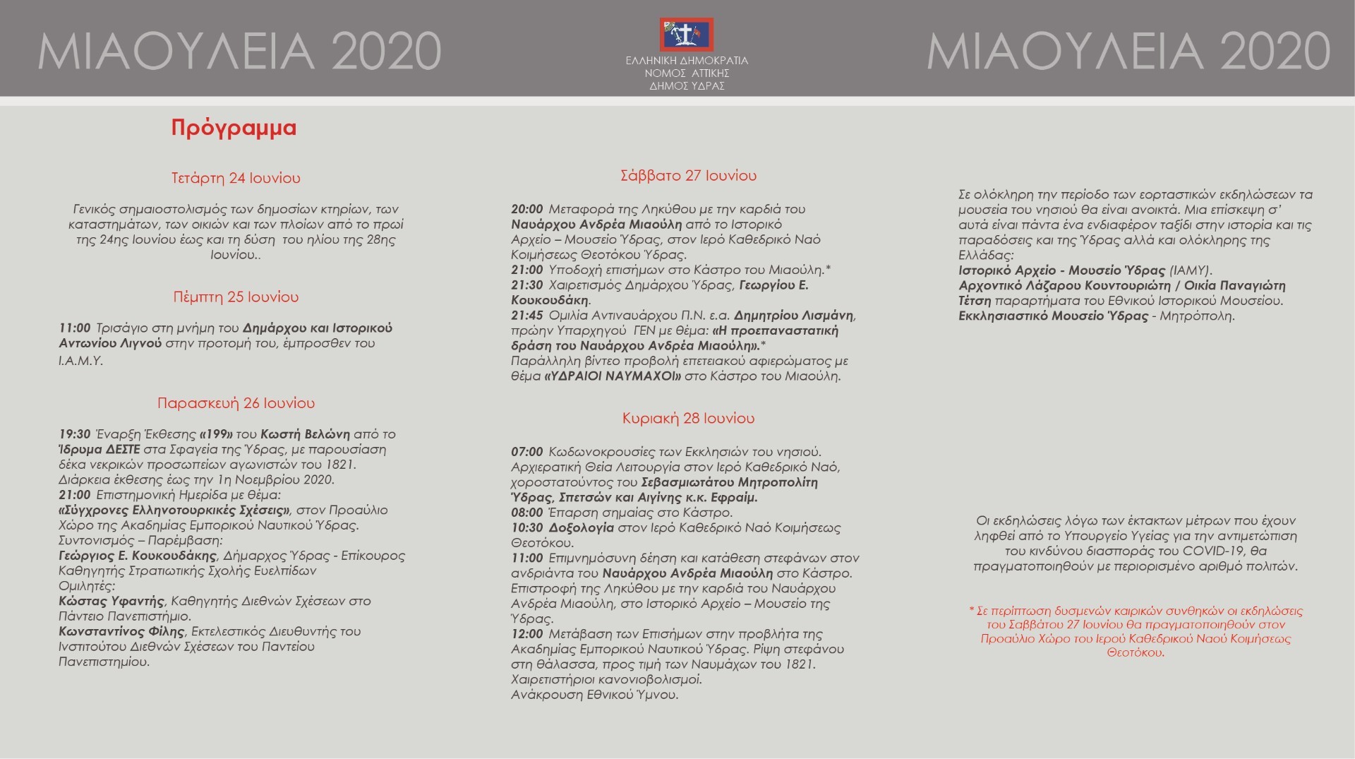 Ο Δήμος Ύδρας, με ένα λιτό πρόγραμμα εκδηλώσεων και τηρώντας τα μέτρα προστασίας κατά της διασποράς του Covid - 19, θα τιμήσει και φέτος τη Μνήμη του μεγάλου εθνικού μας Ήρωα.