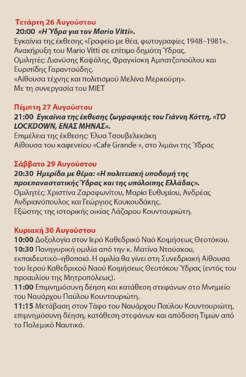 Τιμώντας την 85η επέτειο από τον θάνατο του πρώτου Προέδρου της Ελληνικής Δημοκρατίας, Υδραίου Ναυάρχου Παύλου Κουντουριώτη, ο Δήμος Ύδρας και η Κοινωφελής Επιχείρηση Δήμου Ύδρας πραγματοποιούν τις εορταστικές εκδηλώσεις "Κουντουριώτεια 2020", από τις 23 μέχρι τις 30 Αυγούστου.