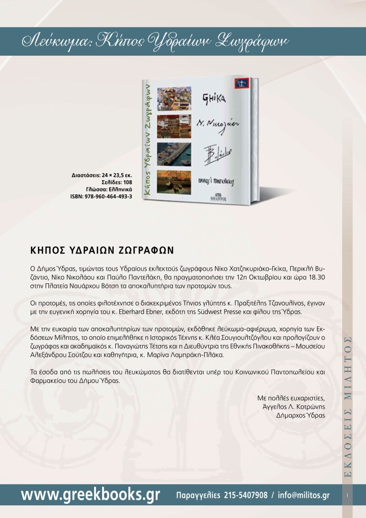 Θα ακολουθήσει παρουσίαση του λευκώματος των Εκδόσεων Μίλητος «Κήπος Υδραίων Ζωγράφων» στην αίθουσα Συνεδριάσεων του Δημοτικού Συμβουλίου.