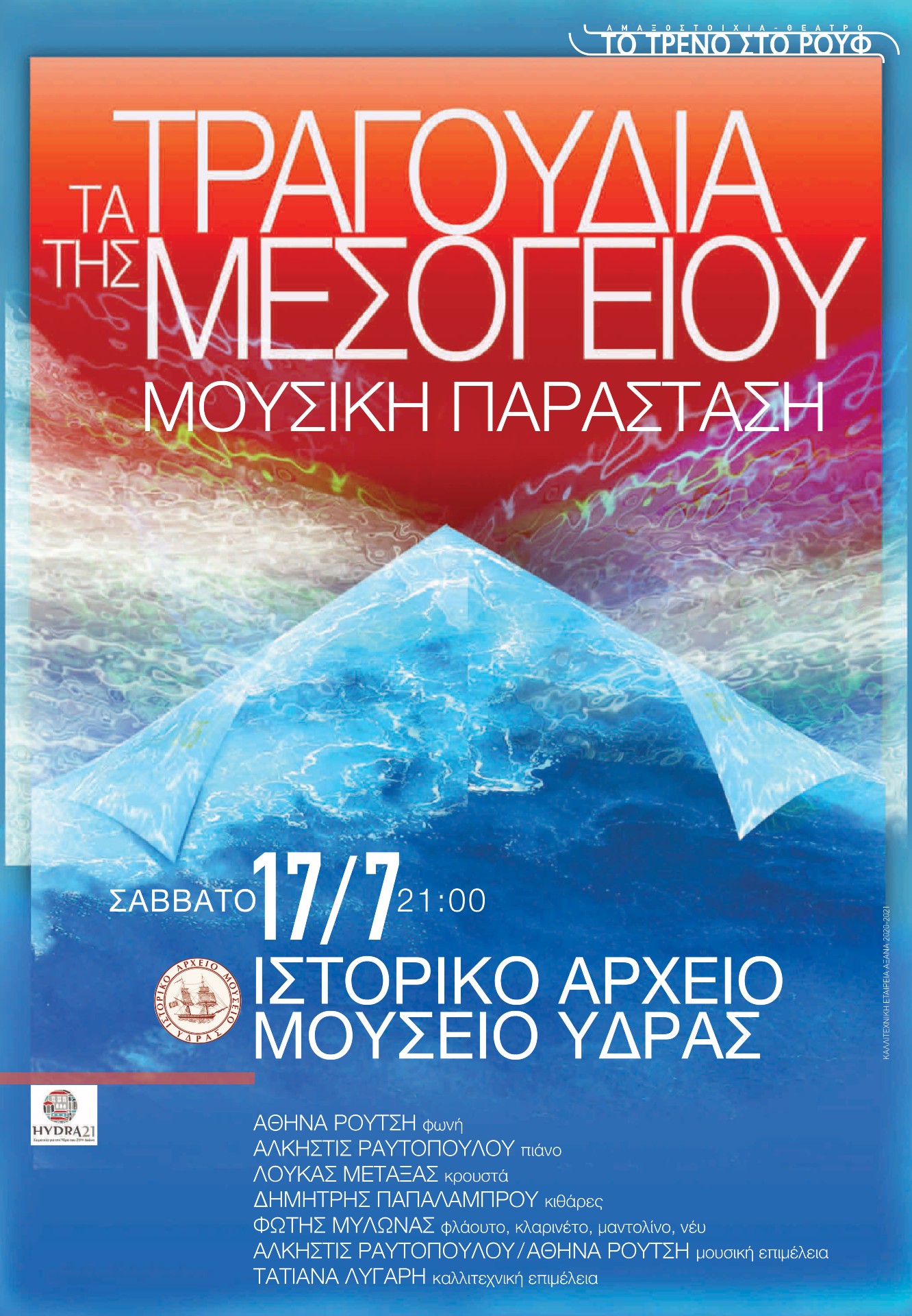 - ΤΑ ΤΡΑΓΟΥΔΙΑ ΤΗΣ ΜΕΣΟΓΕΙΟΥ, είναι η δεύτερη εκδήλωση που οργανώνεται από το σωματείο ΥΔΡΑ 21 σε συνεργασία με το Ιστορικό Αρχείο Μουσείο Ύδρας και θα παρουσιαστεί στο ΙΑΜΥ, το Σάββατο 17 Ιουλίου 2021 και ώρα 21.00.