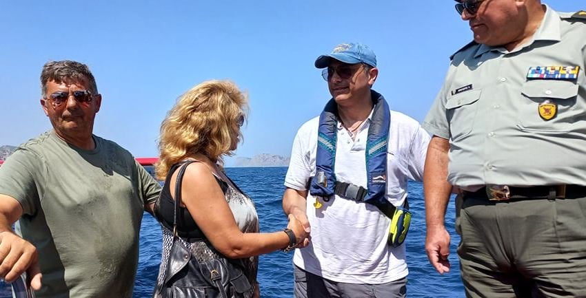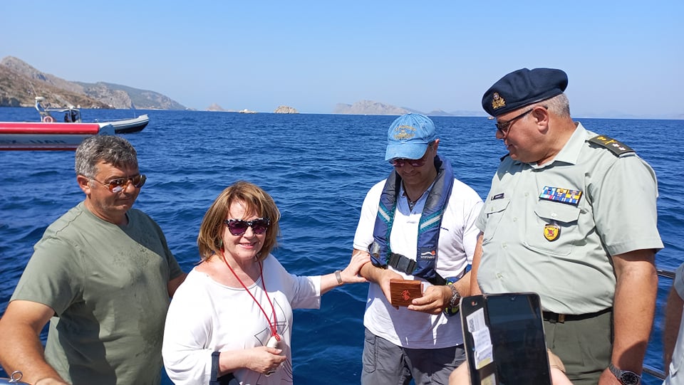 Πάνω σε πλωτό σκάφος, πραγματοποιήθηκε η απονομή αναμνηστικών, τιμής ένεκεν, στον πιλότο Κωνσταντίνο Δροσίδη που πραγματοποίησε με επιτυχία την πτήση, αναβιώνοντας το ταξίδι του Δημητρίου Καμπέρου στη γενέτειρά του.