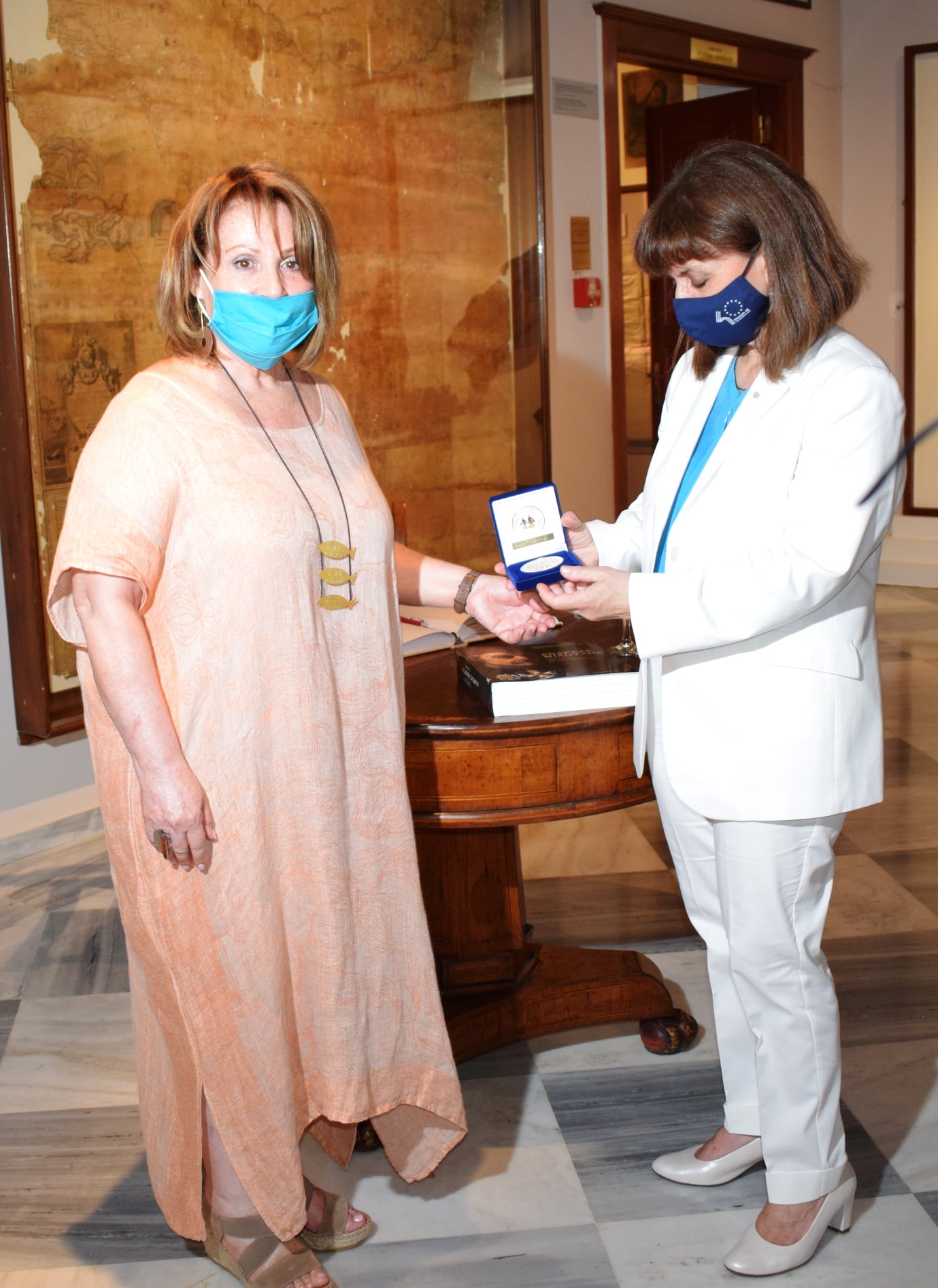 Στο τέλος της ξενάγησης, η Διευθύντρια του Ι.Α.Μ.Υ. προσέφερε τιμής ένεκεν στην Πρόεδρο της Δημοκρατίας το αναμνηστικό μετάλλιο για τα 200 χρόνια από την Ελληνική Επανάσταση και τη βραβευμένη ιστορική μονογραφία «Ανδρέας Μιαούλης, από την υπόδουλη ως την ελεύθερη Ελλάδα» που έχει συγγράψει με την Αννίτα Πρασσά.