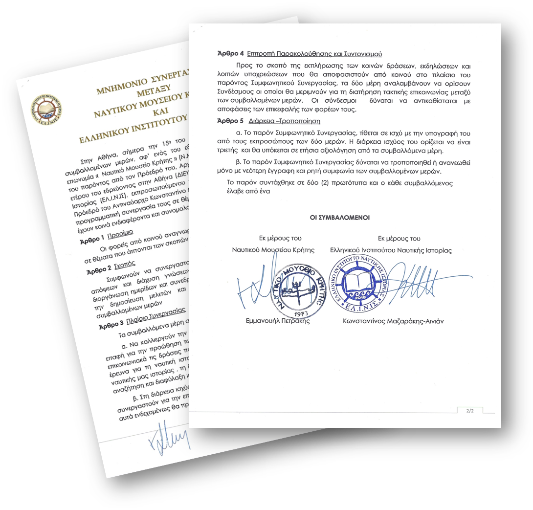 Τη Δευτέρα 15 Νοεμβρίου 2021 υπεγράφη Μνημόνιο Συνεργασίας μεταξύ του Ναυτικού Μουσείου Κρήτης και του Ελληνικού Ινστιτούτου Ναυτικής Ιστορίας (ΕΛ.Ι.Ν.Ι.Σ).