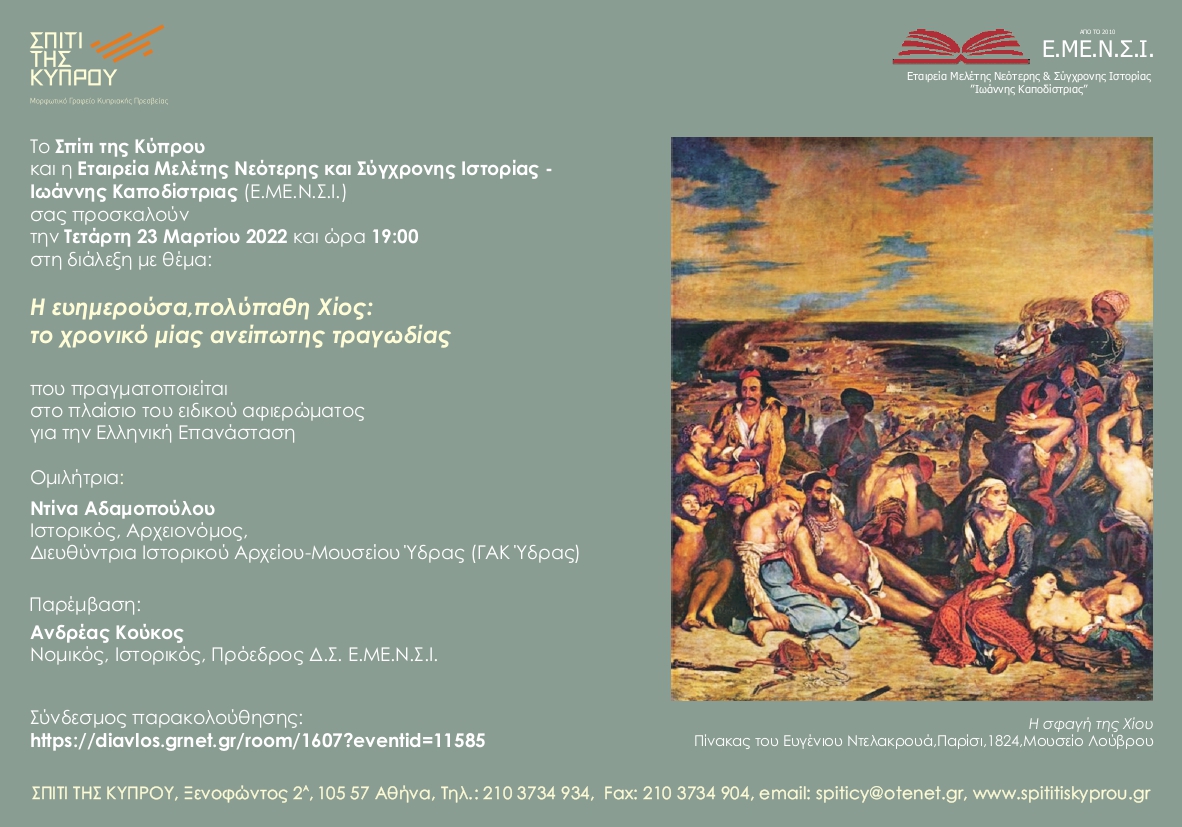 Στο πλαίσιο του ειδικού αφιερώματος για την Ελληνική Επανάσταση του 1821, το «Σπίτι της Κύπρου» και η «Εταιρεία Μελέτης Νεότερης και Σύγχρονης Ιστορίας – Ιωάννης Καποδίστριας» σας προσκαλούν σε διάλεξη την Τετάρτη 23 Μαρτίου 2022 στις 7.00 το απόγευμα.