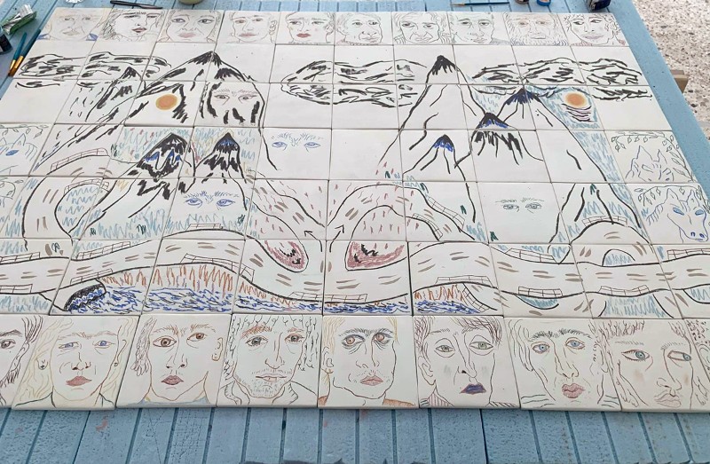 - Ευγενία Βερελή, Dedicated to my lovers, 2022, Σύνθεση με εφυαλωμένα κεραμικά πλακάκια, 105cmx165cm
