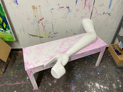 Η Αντιγόνη Τσαγκαροπούλου παρουσιάζει το γλυπτό «Η Λίλη από την κοινότητα της Ροζ Πανσελήνου» που είναι ένα κομμάτι της εγκατάστασης «PinkFullMoon», ένα project και βασίζεται στις έννοιες της φροντίδας, της αλληλεγγύης και της αντίστασης σε δυστοπικούς και μετα-αποκαλυπτικούς καιρούς. Η Λίλη, είναι μέρος της κοινότητας της Ροζ Πανσελήνου, που αποτελείται από υπερμεγέθη, άγρια και μαλακά, μοχθηρά αλλά και χαριτωμένα πλάσματα που αποζητούν την οικειότητα και μπορούν να αγγιχτούν και να αγκαλιαστούν. Υβριδικά πλάσματα της νύχτας και του περιθωρίου, νυχτερίδες βαμπίρ και ταυτόχρονα ανθρωπόμορφες μη απολογητικές θηλυκότητες. Τα αξεσουάρ της υποδηλώνουν τη συμμετοχή της στην υπόλοιπη κοινότητα. Φοράει εξωφρενικά ψηλοτάκουνα παπούτσια με queer πολιτικά μηνύματα που έγραψε με τις φίλες της, πανκ αξεσουάρ και κοσμήματα εμπνευσμένα από τη σκηνή του BDSM, όπως αλυσίδες, δαχτυλίδια, σκουλαρίκια. Η κοινοτική τους φροντίδα αποτελεί το θεμέλιο για την επιβίωσή τους σε έναν δυστοπικό κόσμο που θα μπορούσε να εκληφθεί ως αλληγορία του παρόντος. Και η Κατερίνα Χατζηκωστή με κεντρικό άξονα την δόμηση συγκεχυμένων, φαντασιακών κόσμων, στα σχέδιά της, επικεντρώνεται στην δημιουργία συνθέσεων πολυπλοκότητας των οποίων τα ερεθίσματα αντλεί από τετριμμένα, καθημερινά σώματα συμβάντων που με μια δική τους αμεσότητα γεννούν την προοπτική μιας συνειρμικής ευπλαστότητας. Πειραματίζεται με τη μορφή που γεννά εικαστικές προεκτάσεις σε συνάρτηση με τον χώρο, το χρόνο, το αποτύπωμα. Διερευνά υφές υλικότητας και ήχου, θερμοκρασίας και φωτός καθώς επίσης την κατάσταση συνεχής και διαρκής κίνησης, έντασης, παύσης και τριβής.