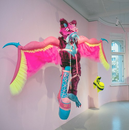 - Αντιγόνη Τσαγκαροπούλου, Lillie from the PinkFullMoon Community / Η Λίλη από την κοινότητα της Ροζ Πανσελήνου, 2021, Συνθετική γούνα, συνθετικό βινύλ, πολυεστερικό μπιλάκι, συνθετικές τρέσες, δερματίνη, βελούδο, πλαστικές αλυσίδες, μεταλικοί κρίκοι, πλαστικό pvc, 3d printing, κορδόνια, πλαστικές χάντρες, τούλι, μαρκαδόροι, 200 x 200 cm