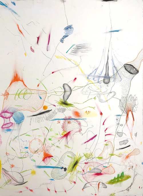 - Δημήτρης Νευδεσκιώτης,I don't know if some random weird things can tell a story but i couldn't care less right now! 2022, Λάδι, Παστέλ, Ακρυλικά, Μαρκαδόρος πάνω σε Καμβά, 180 Χ120cm