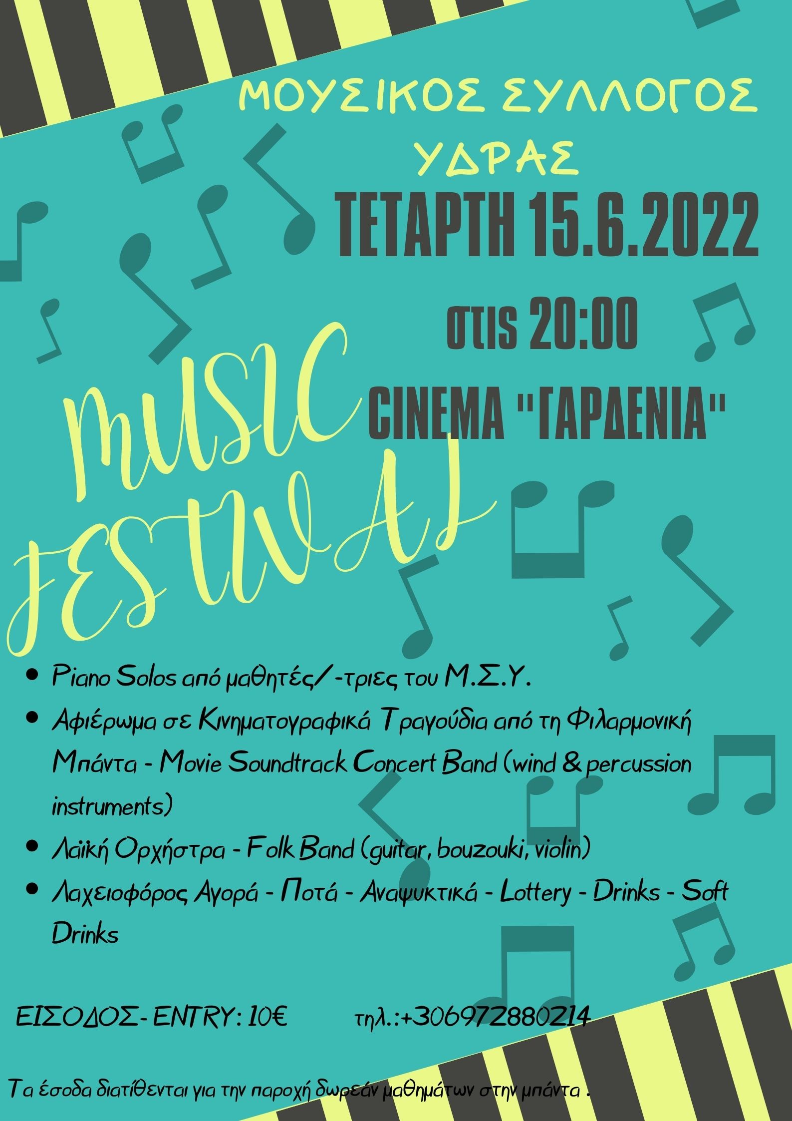 Εκδήλωση του Μουσικού Συλλόγου Ύδρας θα πραγματοποιηθεί στις 15 Ιουνίου και ώρα 20:00 στον χώρο του CINE ΓΑΡΔΕΝΙΑ. Είσοδος 10 ευρώ Τα έσοδα θα διατεθούν για την παροχή δωρεάν μαθημάτων στην μπάντα του Μ.Σ.Υ.