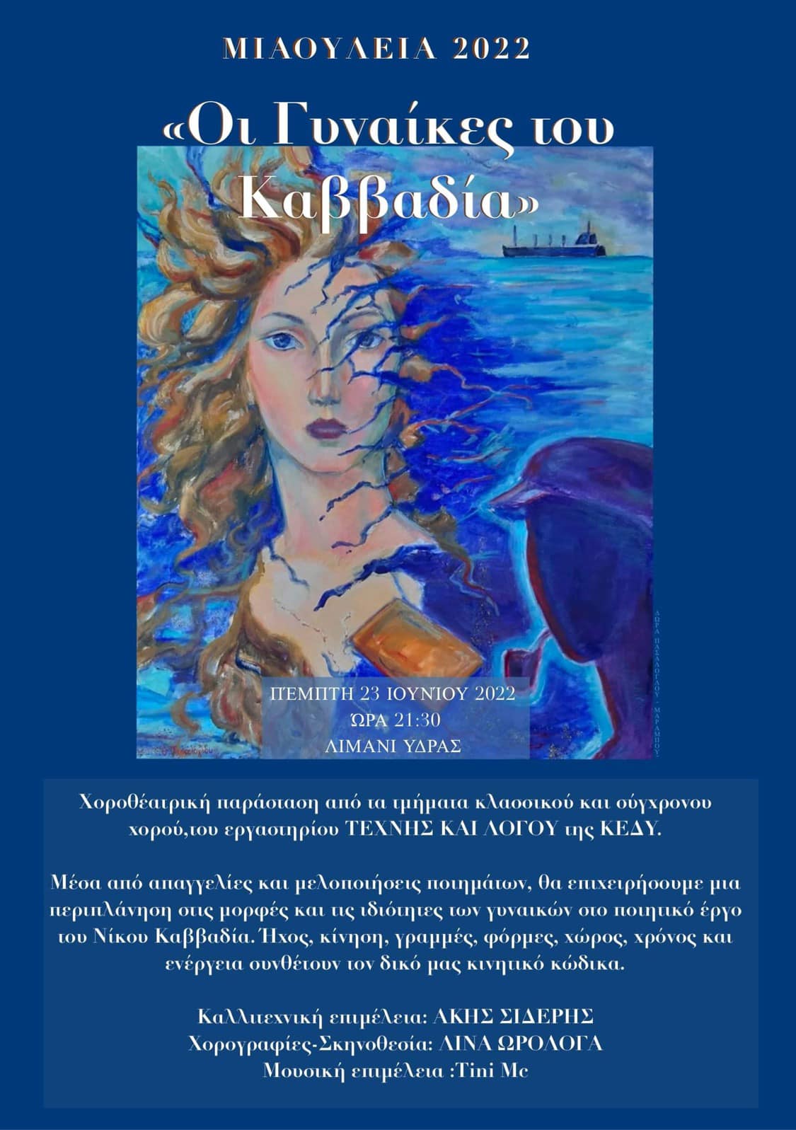 Χοροθεατρική παράσταση από τα τμήματα κλασικού και σύγχρονου χορού του ΕΡΓΑΣΤΗΡΙΟΥ ΤΕΧΝΗΣ ΚΑΙ ΛΟΓΟΥ της ΚΕΔΥ. Την Πέμπτη 23 Ιουνίου στο λιμάνι της Ύδρας. Χορογραφία - Σκηνοθεσία: Λίνα Ωρολογά Καλλιτεχνική Επιμέλεια: Άκης Σιδέρης
