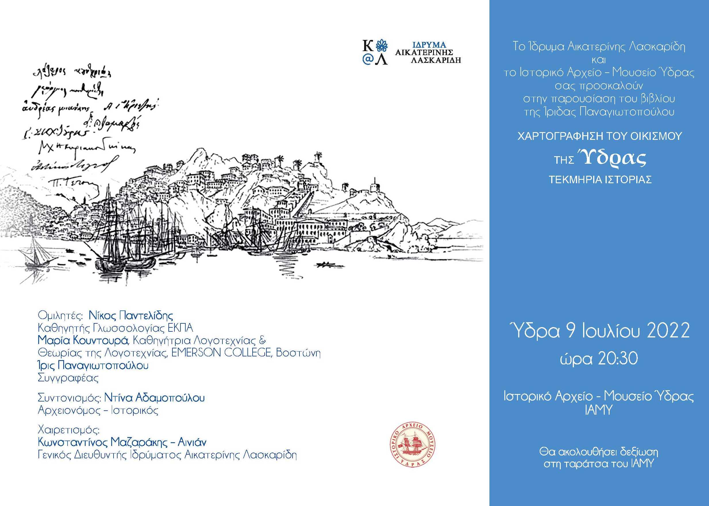 Το Ίδρυμα Αικατερίνης Λασκαρίδη, σε συνεργασία με το Ιστορικό Αρχείο-Μουσείο Ύδρας (ΙΑΜΥ), παρουσιάζει το Σάββατο 9 Ιουλίου και ώρα 20.30, το βιβλίο Χαρτογράφηση του Οικισμού της Ύδρας - Τεκμήρια Ιστορίας, που εκδόθηκε από το Ίδρυμα το 2021.