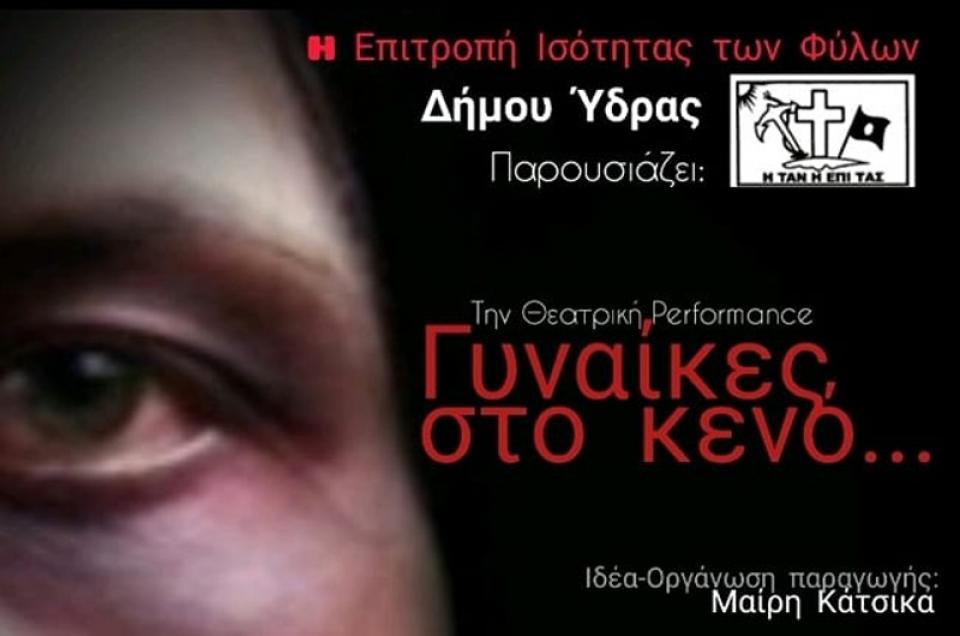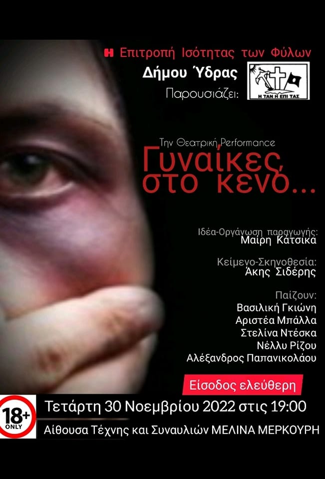 Η Δημοτική Επιτροπή Ισότητας των Φύλων του Δήμου Ύδρας, στο πλαίσιο της Παγκόσμιας Ημέρας για την εξάλειψη της βίας κατά των γυναικών (25/11), παρουσιάζει τη θεατρική παράσταση με τίτλο «Γυναίκες στο Κενό», την Τετάρτη 30 Νοεμβρίου 2022, στις 19:00, στην αίθουσα τέχνης και συναυλιών «ΜΕΛΙΝΑ ΜΕΡΚΟΥΡΗ».