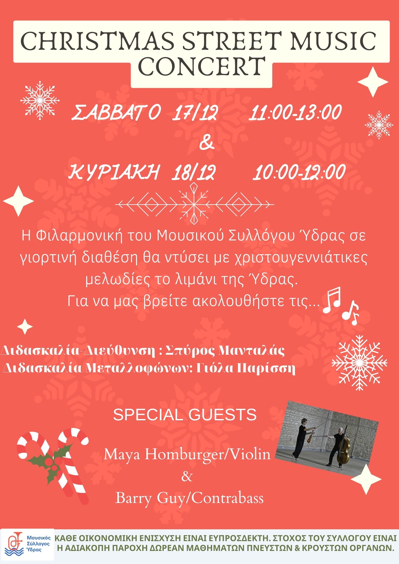 Η Φιλαρμονική του Μουσικού Συλλόγου Ύδρας σας προσκαλεί σε διήμερη Χριστουγεννιάτικη συναυλία δρόμου! Με γιορτινή διάθεση, υπόσχεται να ντύσει με όμορφες χριστουγεννιάτικες μελωδίες το λιμάνι της Ύδρας! Εσείς δεν έχετε παρά να ακολουθήσετε...τις νότες! Η γιορτή θα λάβει χώρα στο λιμάνι της Ύδρας το Σάββατο 17/12, 11:00-13:00 καθώς και την Κυριακή 18/12, 10:00-12:00