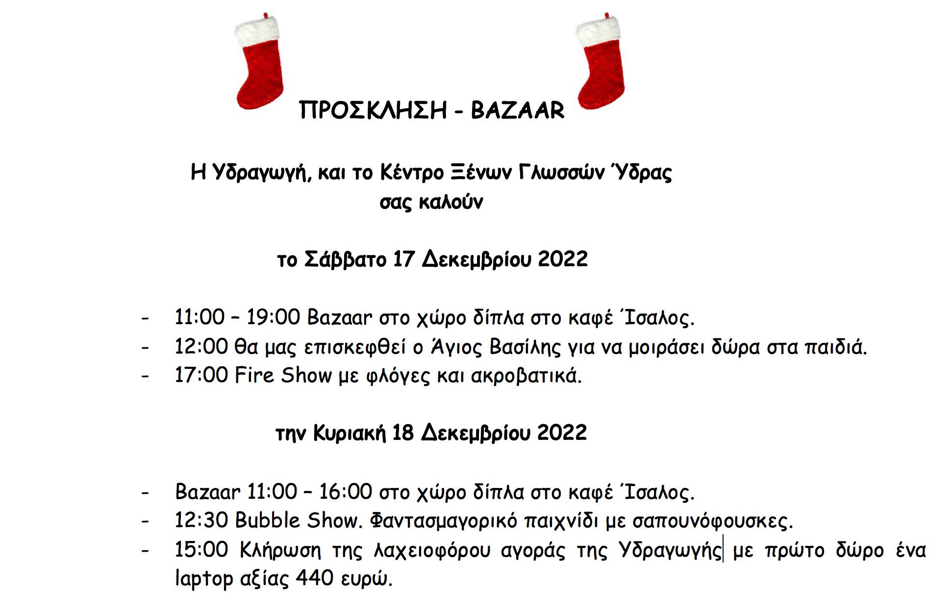 Η Υδραγωγή και το Κέντρο Ξένων Γλωσσών Ύδρας σας καλούν το Σάββατο 17 Δεκεμβρίου και την Κυριακή 18 Δεκεμβρίου 2022 στις ακόλουθες εκδηλώσεις: