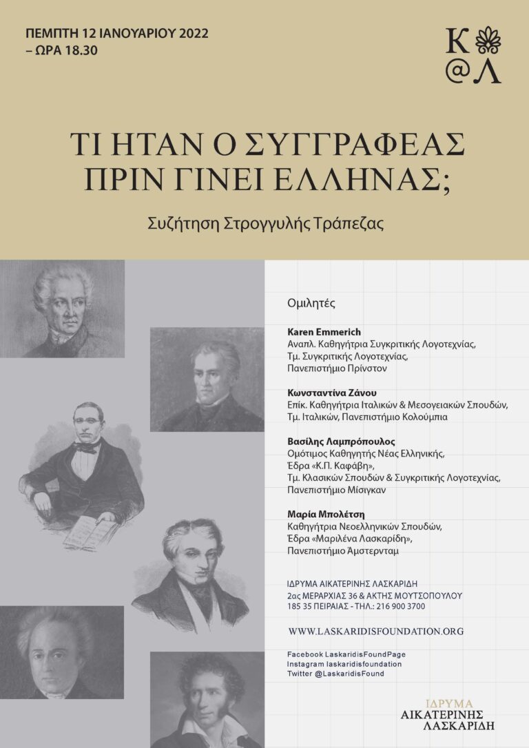 Το Ίδρυμα Αικατερίνης Λασκαρίδη διοργανώνει συζήτηση Στρογγυλής Τράπεζας με θέμα: «Τι ήταν ο συγγραφέας πριν γίνει Έλληνας;». Aφορμή είναι το πρόσφατο βιβλίο της δρ. Κωνσταντίνας Ζάνου Τραυλίζοντας το Έθνος: Διεθνικός Πατριωτισμός στη Μεσόγειο, 1800-1850.
