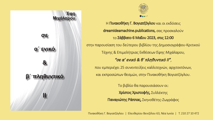 Το Σάββατο 6 Μαΐου 2023, στις 12:00, στην Πινακοθήκη Γ. Βογιατζόγλου, Ν. Ιωνία, θα γίνει η παρουσίαση του βιβλίου ''σε α' ενικό & β' πληθυντικό ΙΙ'', της Δημοσιογράφου ΚριτικούΤέχνης και Επιμελήτριας Εκθέσεων, Έφης Μιχάλαρου, όπου ο συλλέκτης Χρίστος Χριστοφής και ο Σκηνοθέτης Ζωγράφος Παναγιώτης Ράππας, θα κάνουν μία διαφορετική προσέγγιση του βιβλίου.