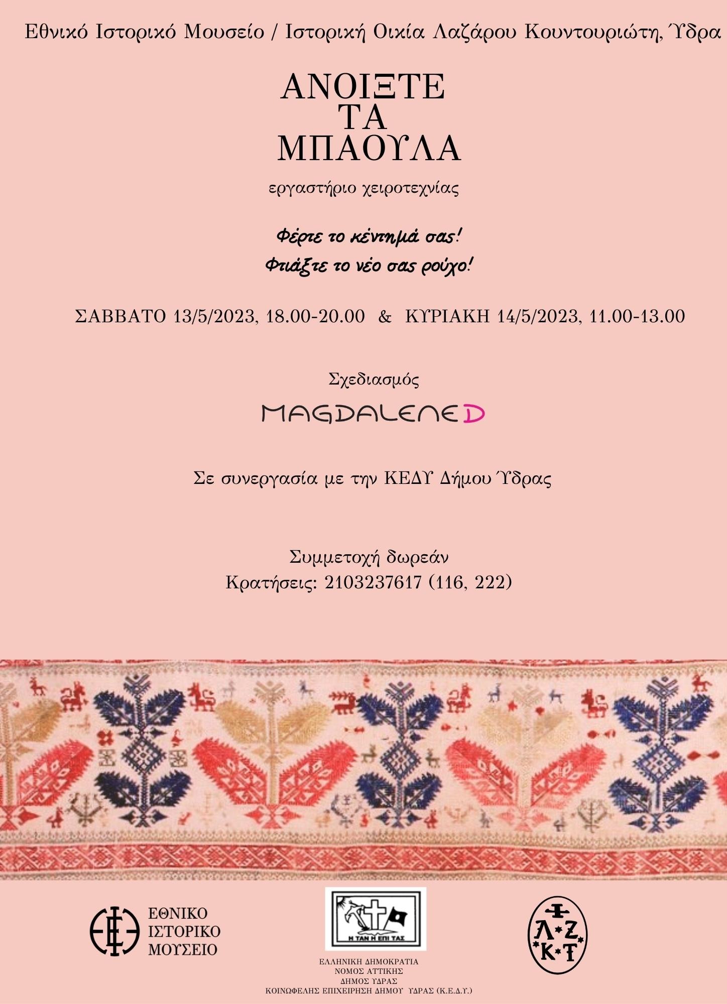 Με την ευκαιρία του εορτασμού της Διεθνούς Ημέρας Μουσείων (18 Μαΐου), το Εθνικό Ιστορικό Μουσείο (ΕΙΜ) σε συνεργασία με την Κοινωφελή Επιχείρηση Δήμου Ύδρας (ΚΕΔΥ), διοργανώνει το Σαββατοκύριακο 13 και 14 Μαΐου εργαστήριο χειροτεχνίας με τίτλο «Ανοίξτε τα μπαούλα» στην Ιστορική Οικία Λαζάρου Κουντουριώτη, παράρτημα του Μουσείου (ΕΙΜ) στην Ύδρα.