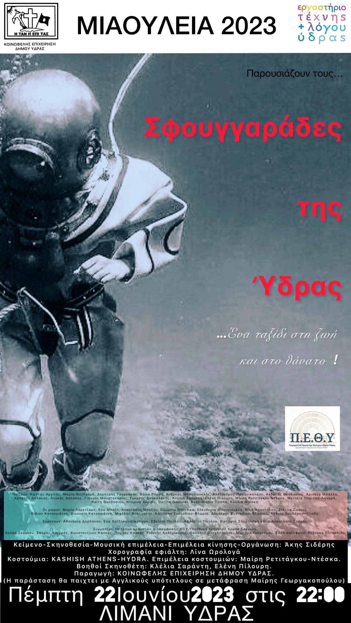 Την Πέμπτη 22 Ιουνίου και ώρα 22:00 στο λιμάνι της Ύδρας θα πραγματοποιηθεί από το Π.Ε.Θ.Υ Εικαστικό Θέατρο (Πειραματικό Εργαστήριο Θεάτρου Ύδρας), η παράσταση "Οι Σφουγγαράδες της Ύδρας"... Ένα ταξίδι στη ζωή και στο θάνατο.