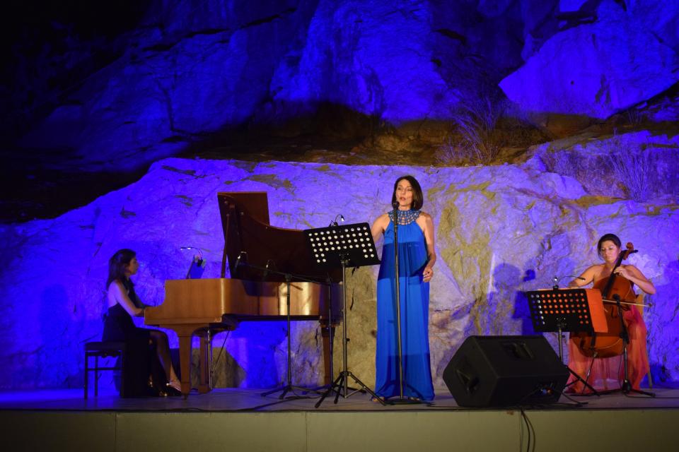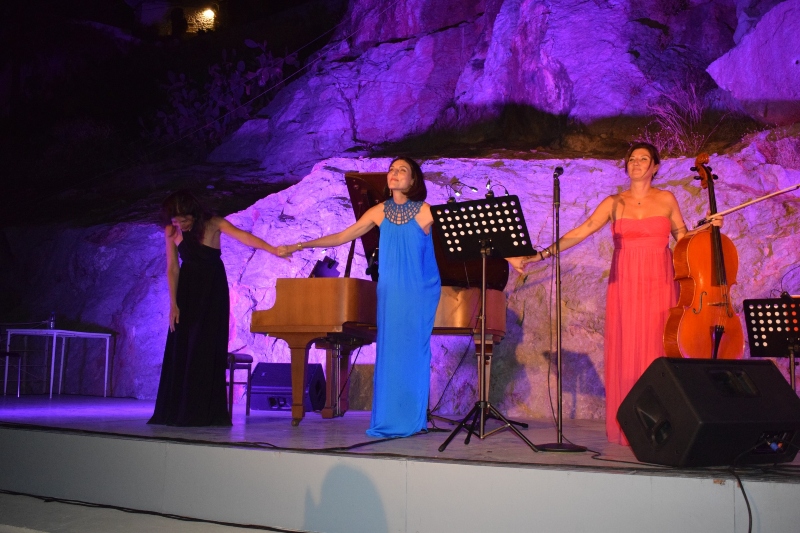 Οι τρεις καλλιτέχνιδες επί σκηνής, μάγεψαν το κοινό με τις μελωδίες του πιάνου και του βιολοντσέλο αλλά και με την εξαιρετικά αισθαντική φωνή που τα συνόδεψε σε μουσικές νότες των Berlioz, Hahn, Faure, Massenet, Satie, Ξανθούλη, Piazzola, de Falla κ.α.