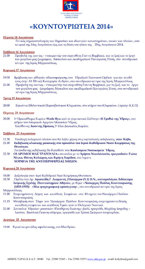 Τιμώντας την 79η επέτειο από τον θάνατο του πρώτου Προέδρου της Ελληνικής Δημοκρατίας, Υδραίου Ναυάρχου Παύλου Κουντουριώτη, ο Δήμος Ύδρας πραγματοποιεί τις εκδηλώσεις "Κουντουριώτεια 2014". Αναλυτικά το πρόγραμμα του εορτασμού.