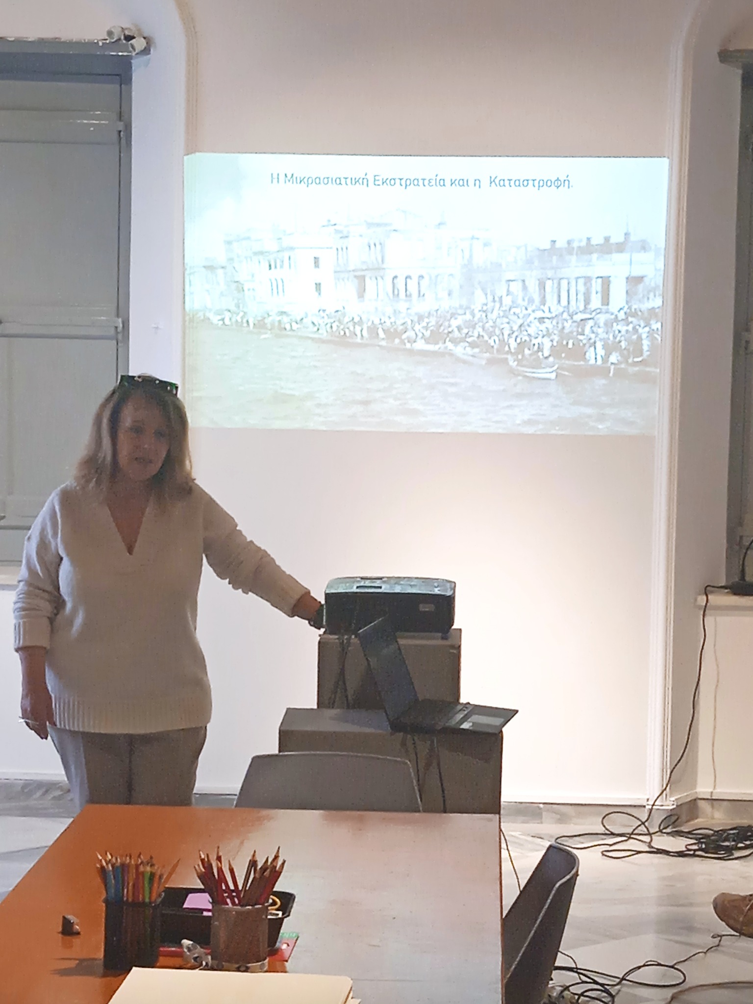 Στη συνέχεια, παρουσιάστηκε οπτικοακουστικό υλικό με θέμα τη μικρασιατική καταστροφή και αμέσως μετά έγινε η γνωριμία με τη βιβλιοσκευή. Αφού άκουσαν αποσπάσματα από βιβλίο σχετικό με το ιστορικό αυτό γεγονός και τα βιώματα των Ελλήνων προσφύγων και αντλώντας έμπνευση από αυτά, οι μαθητές/τριες δημιούργησαν αργότερα το δικό τους βιβλίο.