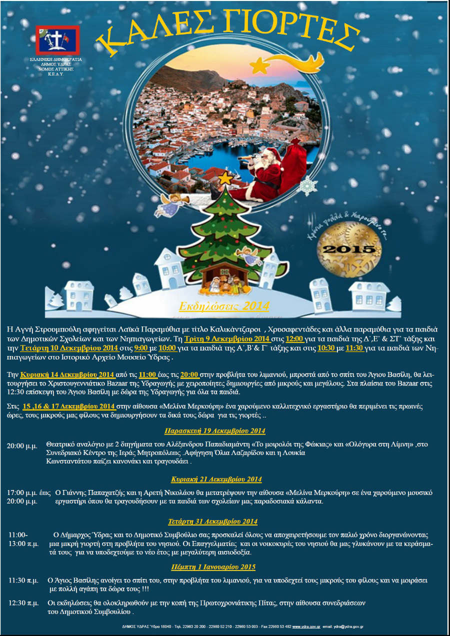 Λαϊκά παραμύθια, παραδοσιακά κάλαντα, θεατρικό αναλόγιο με διηγήματα του Παπαδιαμάντη, καλλιτεχνικό εργαστήριο, είναι μερικές από τις εκδηλώσεις που θα πραγματοποιήσει ο Δήμος Ύδρας από τις 9 Δεκεμβρίου μέχρι την Πρωτοχρονιά.