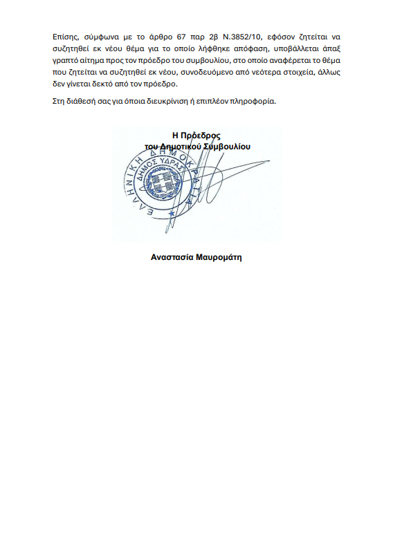 Η Πρόεδρος του Δημοτικού Συμβουλίου Αναστασία Μαυρομάτη στην παρακάτω επιστολή της απαντά στην αίτηση του δημοτικού συμβούλου Μανώλη Καραμήτσου, που ζητούσε την έκτακτη σύγκληση του Δημοτικού Συμβουλίου σχετικά με τη δωρεά της εταιρείας «SALAMINIA YACHTING LIMITED».