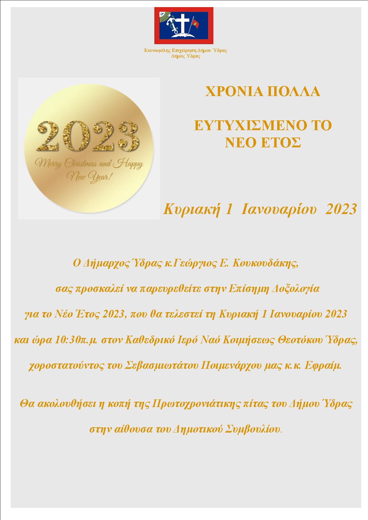 O Δήμαρχος Ύδρας Γ. Κουκουδάκης προσκαλεί την Κυριακή 1 Ιανουαρίου 2023, στην Επίσημη Δοξολογία για το Νέο Έτος στον Ι. Καθεδρικό Ναό Ύδρας χοροστατούντος του Σεβασμιότατου Μητροπολίτη Ύδρας, Σπετσών και Αιγίνης κ. ΕΦΡΑΙΜ.