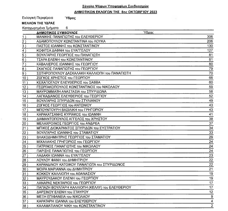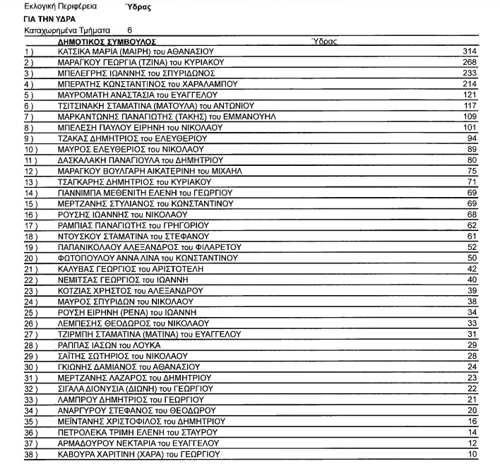 Στους 3121 εγγεγραμμένους στον Δήμο Ύδρας ψήφισαν 1835, άκυρα 35, λευκά 15.