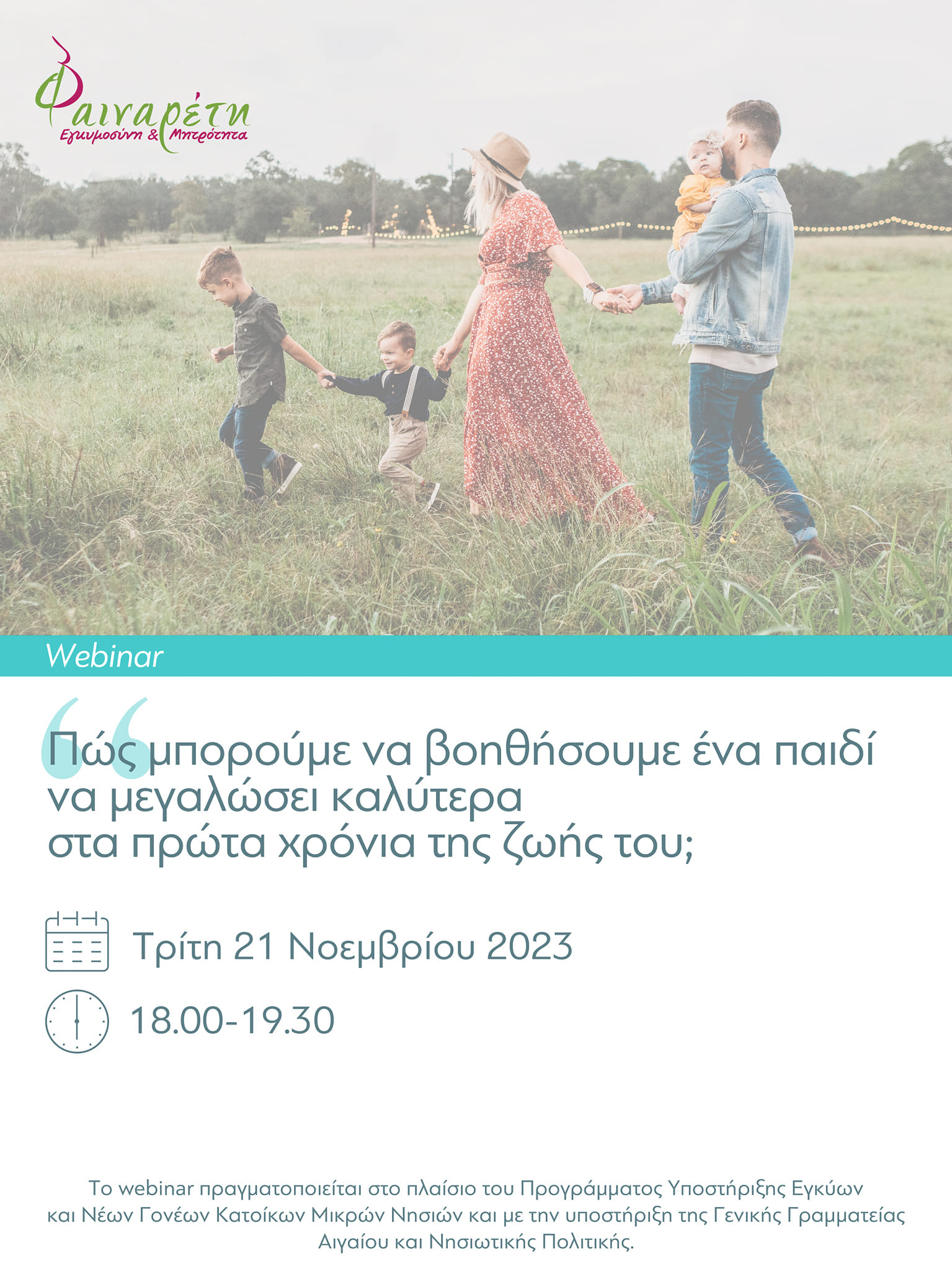 Το webinar πραγματοποιείται στο πλαίσιο του «Προγράμματος υποστήριξης εγκύων και νέων γονέων κατοίκων μικρών νησιών» το οποίο υλοποιείται από την ΑμΚΕ Φαιναρέτη σε συνεργασία και με τη χρηματοδότηση της Γενικής Γραμματείας Αιγαίου και Νησιωτικής Πολιτικής του Υπουργείου Ναυτιλίας και Νησιωτικής Πολιτικής.