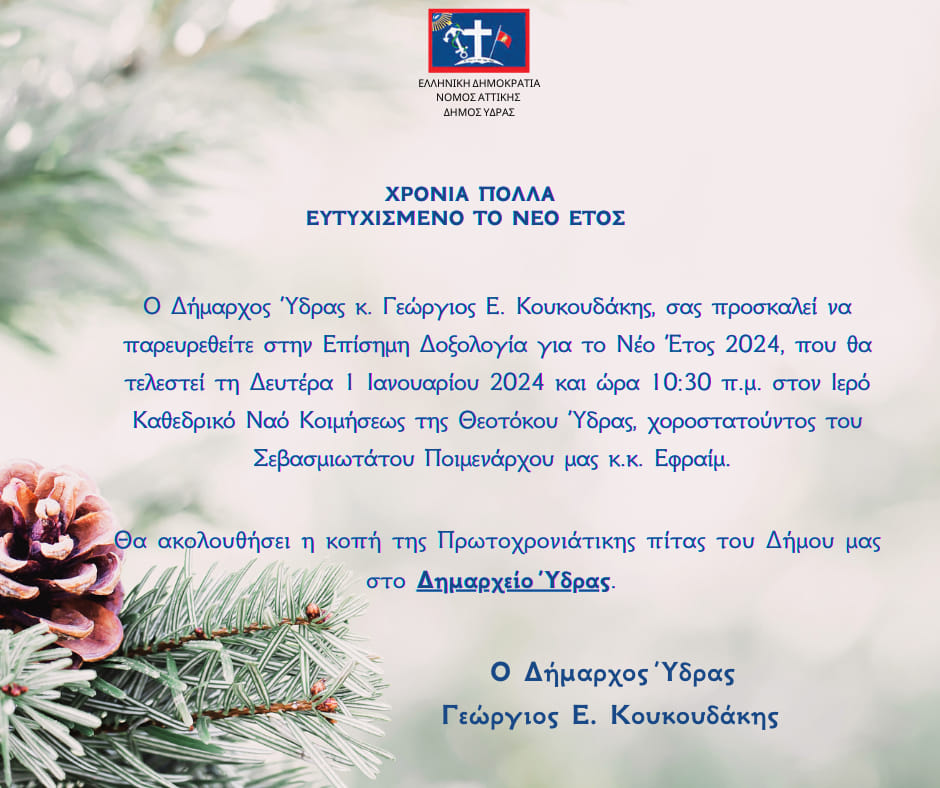 Επίσημη δοξολογία για το νέο έτος 2024 θα τελεστεί τη Δευτέρα 1 Ιανουαρίου 2024 και ώρα 10:30 π.μ. στον Ιερό Καθεδρικό Ναό Κοιμήσεως Θεοτόκου Ύδρας χοροστατούντος του Σεβασμιωτάτου Ποιμενάρχου μας κ.κ. Εφραίμ.