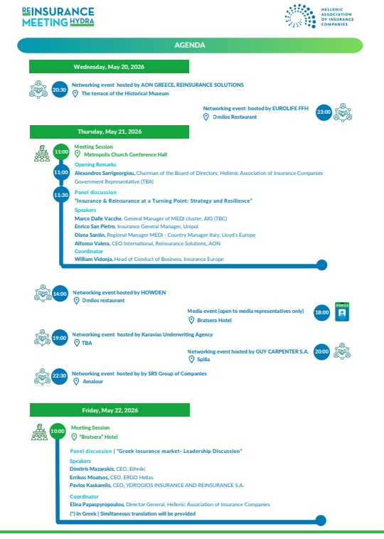 Η καθιερωμένη πλέον διοργάνωση, γνωστή και ως Insurance Reinsurance Meeting, θα πραγματοποιηθεί από τις 20 έως τις 22 Μαΐου 2026, συγκεντρώνοντας κορυφαία στελέχη της ελληνικής και ευρωπαϊκής ασφαλιστικής αγοράς.