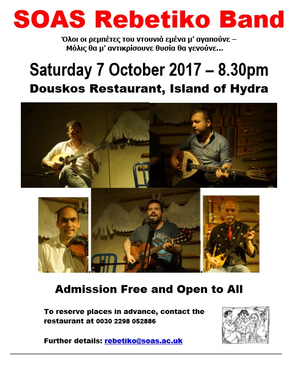 Το Ρεμπέτικο Συνέδριο Ύδρας αλλά και η καθιερωμένη ρεμπέτικη συναυλία που διοργανώνουν ο Ed Emery, το SOAS Rebetiko BAND και το Ινστιτούτο Ρεμπετολογίας θα έρθουν στην Ύδρα για να προσφέρουν ρεμπέτικες συναντήσεις σε ταβέρνες και στέκια αλλά και να παίξουν ζωντανά, διασκεδάζοντας το κοινό τους.