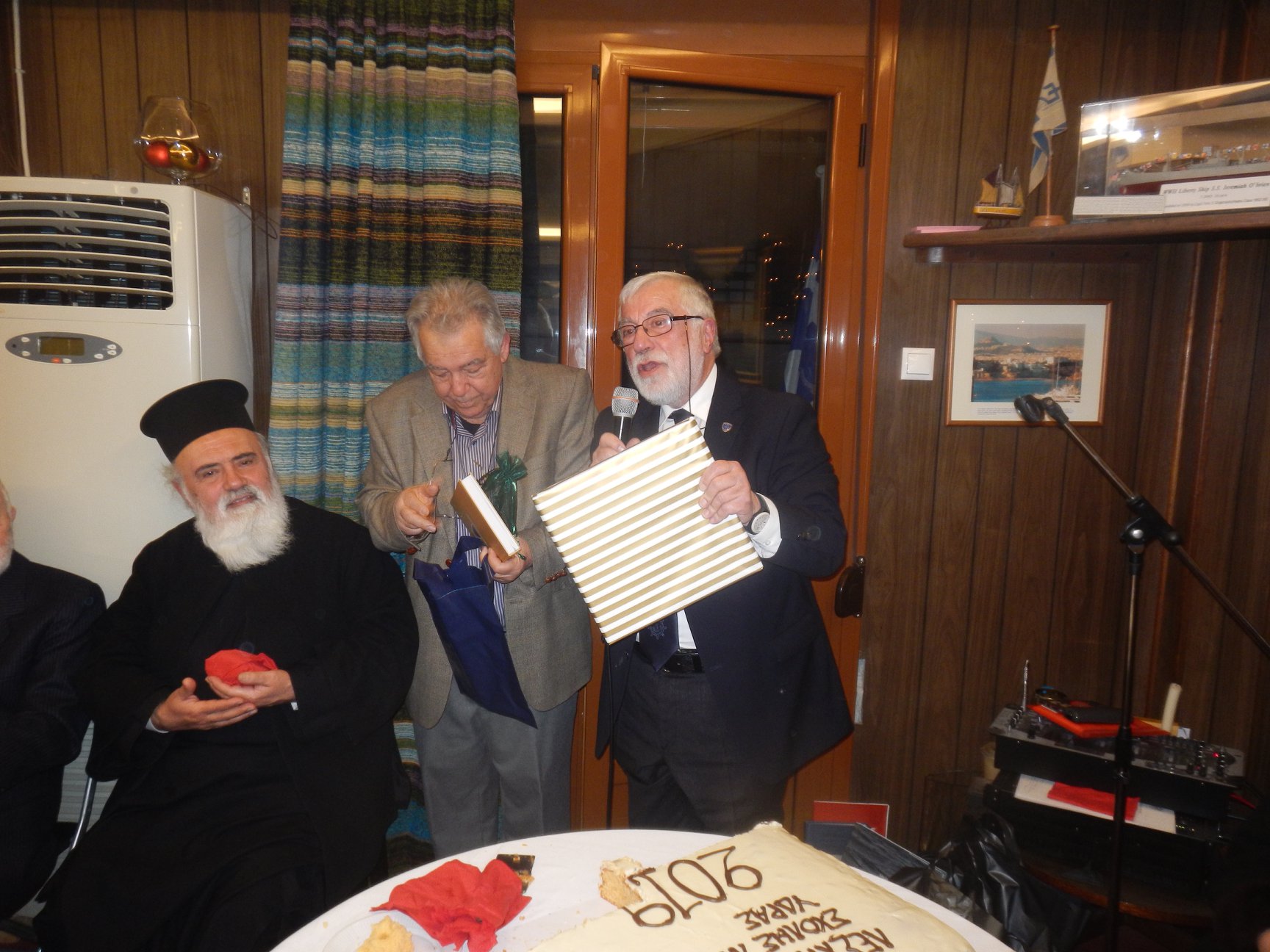 Στη συνέχεια ο Πρόεδρος καπετάν Θανάσης Ζεύκης ανεφέρθη στη σημαντική βοήθεια που πρόσφεραν στη Λέσχη κατά τη διάρκεια του περασμένου χρόνου τα εκλεκτά μέλη της καπετάν Κωνσταντίνος Πρίφτης και Δημήτριος Καραμανωλάκης, στους οποίους παρέδωσε τιμητικώς, εκ μέρους όλων των μελών του Δ.Σ. της Λέσχης, από ένα αντίτυπο του προαναφερθέντος βιβλίου-λευκώματος του κ. Γεωργίου Φουστάνου.