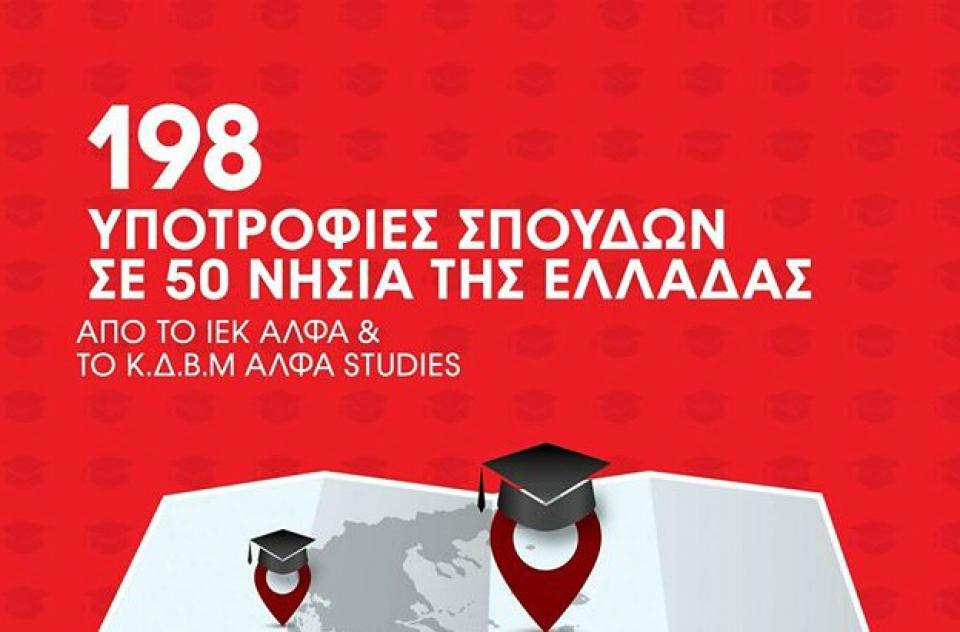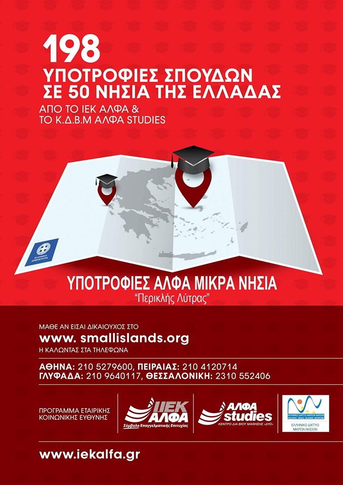 Με στόχο την ενίσχυση του δικαιώματος όλων των νέων των Ελληνικών Μικρών Νησιών στην Εκπαίδευση και τη γενικότερη στήριξη της νησιωτικής Ελλάδας, το Ελληνικό Δίκτυο Μικρών Νησιών και το ΙΕΚ ΑΛΦΑ σε Αθήνα, Πειραιά, Γλυφάδα και Θεσσαλονίκη συμπράττουν, παρέχοντας 198 υποτροφίες σπουδών, στο πλαίσιο της Εταιρικής Κοινωνικής Ευθύνης.