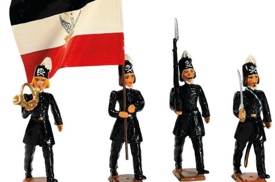 Μολυβένια επιχρωματισμένα ομοιώματα σαλπιγκτή, σημαιοφόρου, οπλίτη και αξιωματικού με τη χαρακτηριστική, ευρωπαϊκού τύπου, μαύρη στολή του Λόχου.