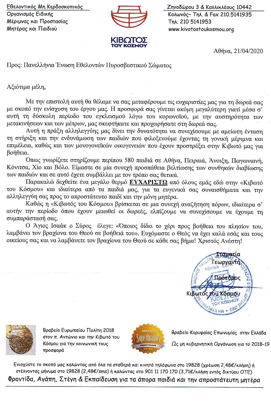 Στην πατρίδα μας έχουμε την ευτυχία να υπάρχει μια δομή, η Κιβωτός του Κόσμου, που την αγάπη και την αλληλεγγύη στα παιδιά την έχει κάνει πράξη και της οποίας την προσπάθεια ηγείται ο πατέρας Αντώνιος.