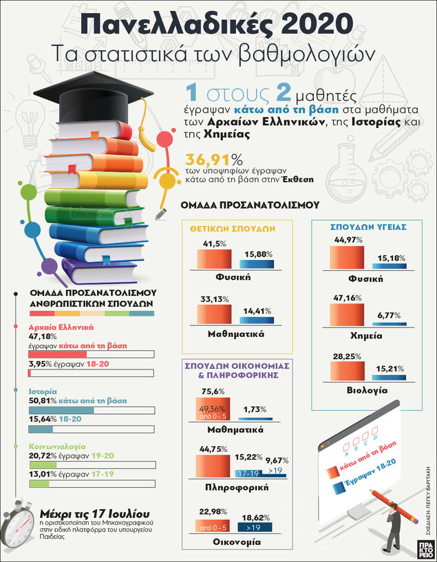 Σε ένα γράφημα του ΑΠΕ-ΜΠΕ παρουσιάζονται στοιχεία για τις επιδόσεις όλων των υποψηφίων στις φετινές Πανελλαδικές Εξετάσεις.