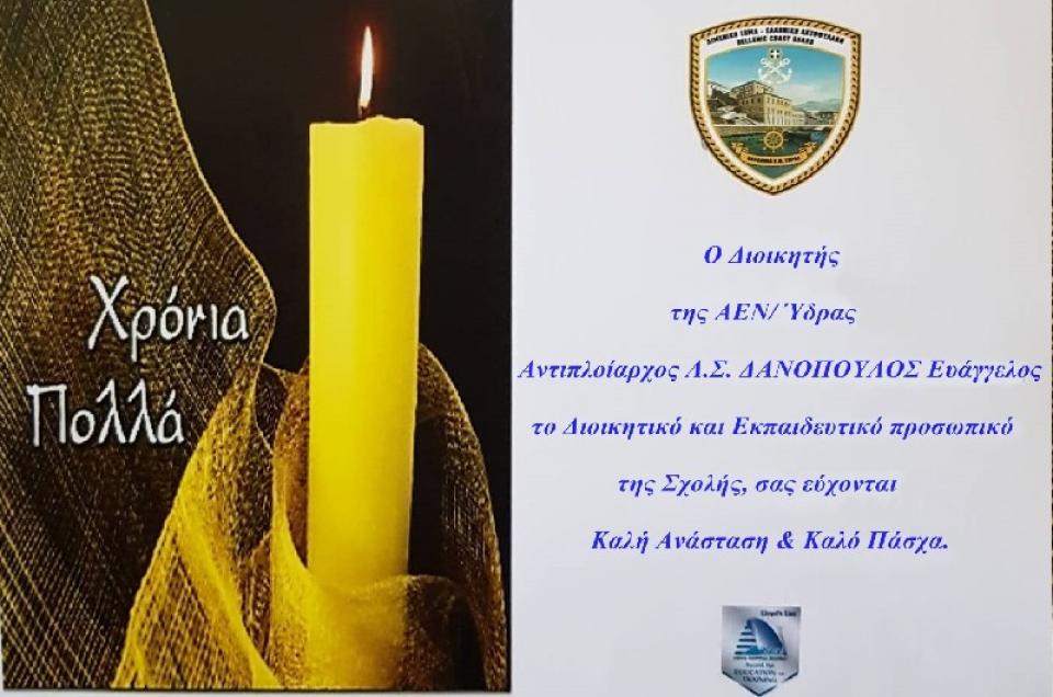 Ο Διοικητής της ΑΕΝ Ύδρας, Αντιπλοίαρχος Λ.Σ. ΔΑΝΟΠΟΥΛΟΣ ΕΥΑΓΓΕΛΟΣ, το Διοικητικό και Εκπαιδευτικό προσωπικό της Σχολής, σας εύχονται με την παρακάτω κάρτα Καλή Ανάσταση και Καλό Πάσχα.