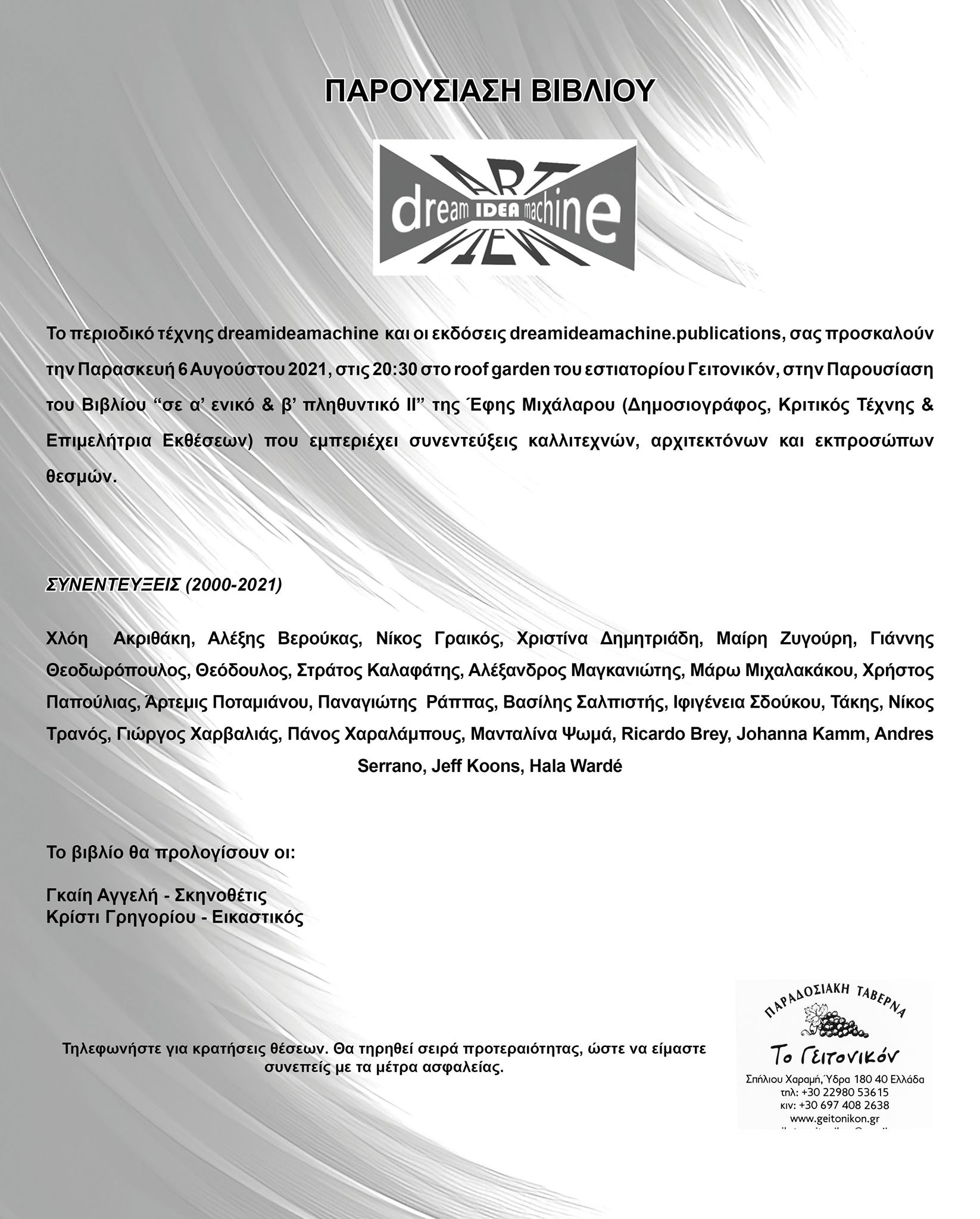 Το περιοδικό τέχνης dreamideamachine και οι εκδόσεις dreamidea machine.publications προσκαλούν την Παρασκευή 6 Αυγούστου 2021, στις 20:30 στο roof garden του εστιατορίου Γειτονικόν-στην Ύδρα, στην Παρουσίαση του Βιβλίου “σε α’ ενικό & β’ πληθυντικό ΙΙ” της Έφης Μιχάλαρου (Δημοσιογράφος-Κριτικός Τέχνης & Επιμελήτρια Εκθέσεων), που εμπεριέχει: 25 συνεντεύξεις καλλιτεχνών, αρχιτεκτόνων και εκπροσώπων θεσμών.