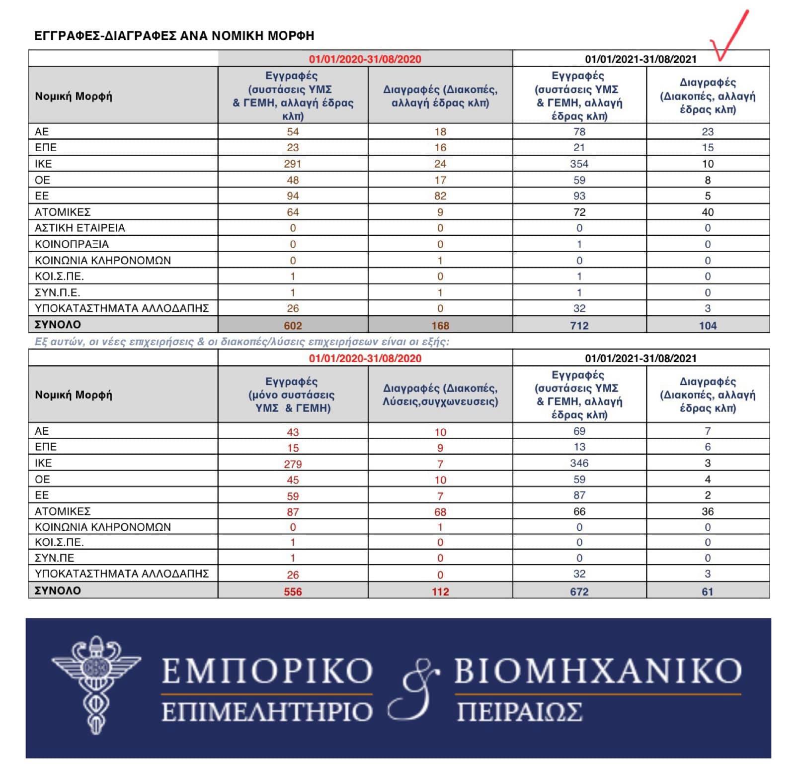 Το ισοζύγιο εγγραφών και διαγραφών στο Ε.Β.Ε.Π. για το οκτάμηνο του 2021, παρά τις δύσκολες συνθήκες, συνεχίζει με θετικό πρόσημο, αυξημένο κατά 40% και με επιπλέον 608 νέες επιχειρήσεις, έναντι 434 το ίδιο διάστημα πέρυσι. Συγκεκριμένα, από 1/1/21 έως και 31/8/21 στο Ε.Β.Ε.Π εγγράφηκαν 712 επιχειρήσεις, εκ των οποίων οι 672 ήταν νέες συστάσεις, έναντι 602 και 556 αντίστοιχα πέρυσι. Σύμφωνα με τη αναλυτική βάση δεδομένων, οι επιχειρήσεις που ιδρύθηκαν ήταν 354 ΙΚΕ, 93 ΕΕ, 78 ΑΕ, 59 ΟΕ, 32 υποκαταστήματα αλλοδαπής, 21 ΕΠΕ και 75 λοιπών μορφών. Αντίστοιχα το οκτάμηνο του 2021, διεγράφησαν 104 επιχειρήσεις που λύθηκαν, συγχωνεύτηκαν, μετέτρεψαν τη νομική τους μορφή ή μετέφεραν την έδρα τους, ενώ οι 61 από αυτές διέκοψαν οριστικά τη λειτουργία τους. Το οκτάμηνο του 2021, καταγράφεται στο ΕΒΕΠ μια δυναμική αύξηση άνω του 18% των εγγραφών και μια δραστική μείωση 62% των διαγραφών.