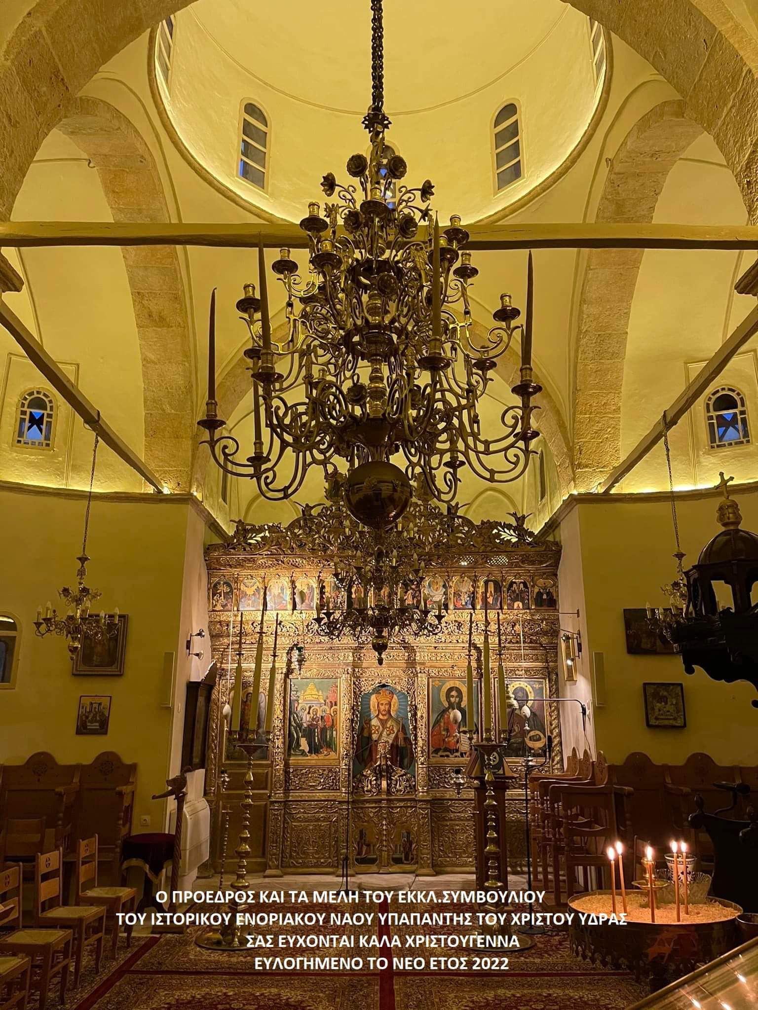 Ο Πρόεδρος και τα μέλη του Εκκλησιαστικού Συμβουλίου του Ιστορικού Ενοριακού Ναού της Υπαπαντής του Χριστού Ύδρας εύχονται με την παρακάτω κάρτα Καλά Χριστούγεννα και Ευλογημένο το Νέο Έτος 2022.