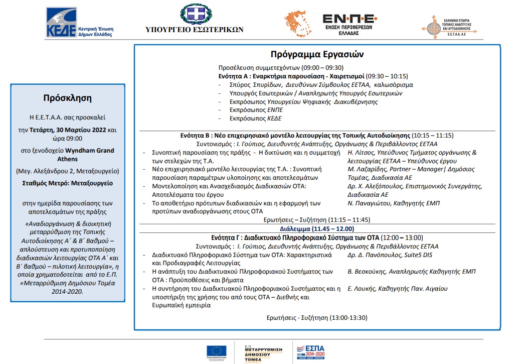 Η Ελληνική Εταιρία Τοπικής Ανάπτυξης και Αυτοδιοίκησης (Ε.Ε.Τ.Α.Α.), σε συνεργασία με, το Υπουργείο Εσωτερικών (ΥΠ.ΕΣ), την Κεντρική Ένωση Δήμων Ελλάδας (Κ.Ε.Δ.Ε.) και την Ένωση Περιφερειών Ελλάδας (ΕΝ.Π.Ε.), διοργανώνει την Τετάρτη, 30 Μαρτίου 2022 και ώρα 09:00, στο ξενοδοχείο Wyndham Grand Athens (Μεγ. Αλεξάνδρου 2, Αθήνα, (Σταθμός Μετρό: Μεταξουργείο), Ημερίδα με θέμα: «Παρουσίαση των Αποτελεσμάτων της Πράξης: Αναδιοργάνωση και διοικητική μεταρρύθμιση της Τοπικής Αυτοδιοίκησης Α΄ και Β΄ Βαθμού – Απλούστευση και προτυποποίηση διαδικασιών λειτουργίας ΟΤΑ Α΄ και Β΄ βαθμού – Πιλοτική λειτουργία»