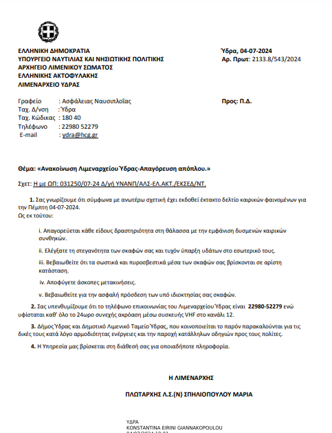 Ανακοίνωση Λιμεναρχείου Ύδρας για απαγόρευση απόπλου