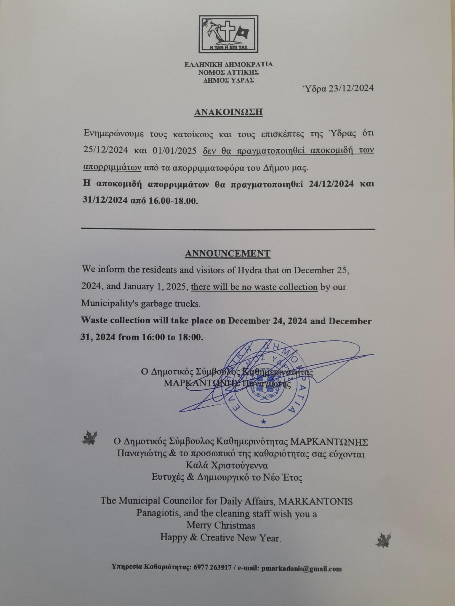 O δημοτικός σύμβουλος καθημερινότητας Παναγιώτης Μαρκαντώνης ενημερώνει τους πολίτες, ότι στις 25/12/24 και την 01/01/25 δεν θα πραγματοποιηθεί αποκομιδή των απορριμμάτων από τον Δήμο.