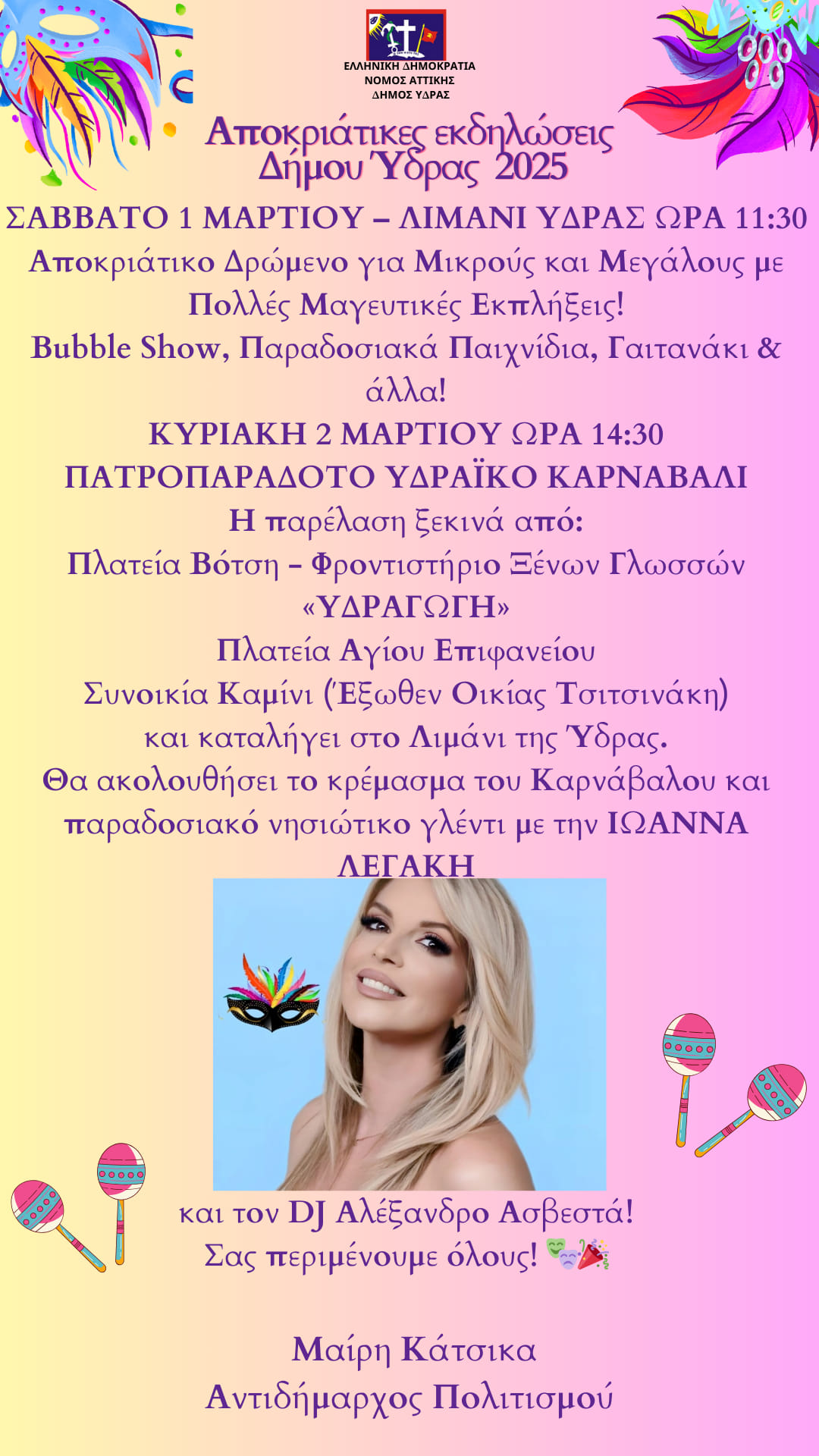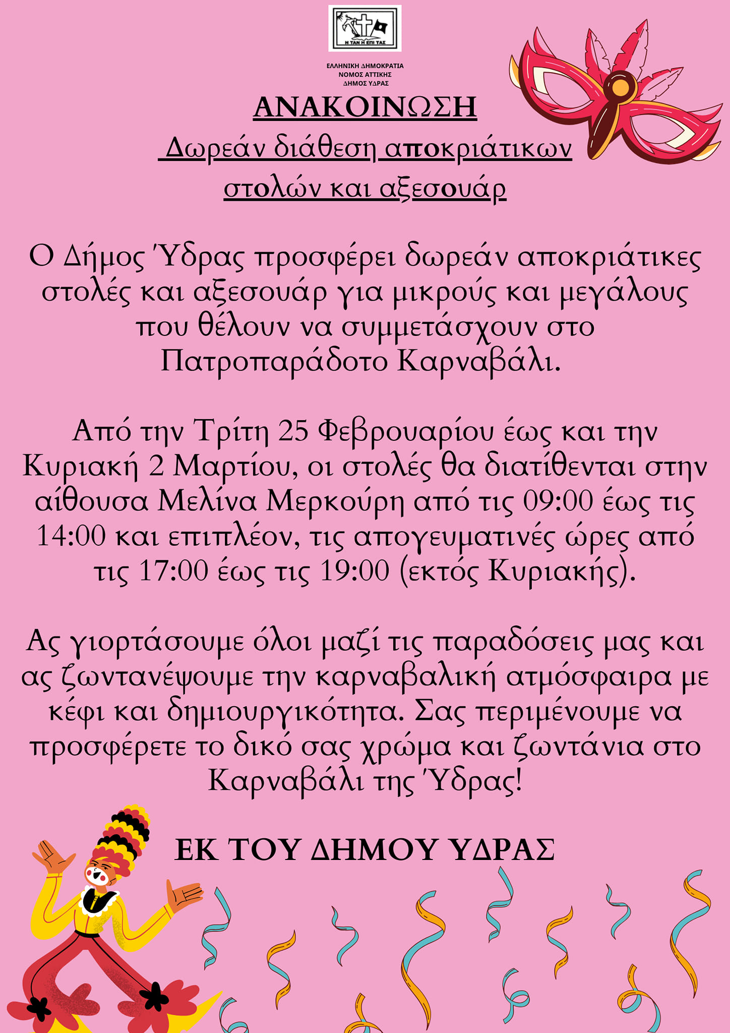 Ο Δήμος Ύδρας σας προσκαλεί να γιορτάσουμε όλοι μαζί τις Απόκριες με πολύ κέφι, χρώμα και παραδοσιακές εκδηλώσεις για μικρούς και μεγάλους!